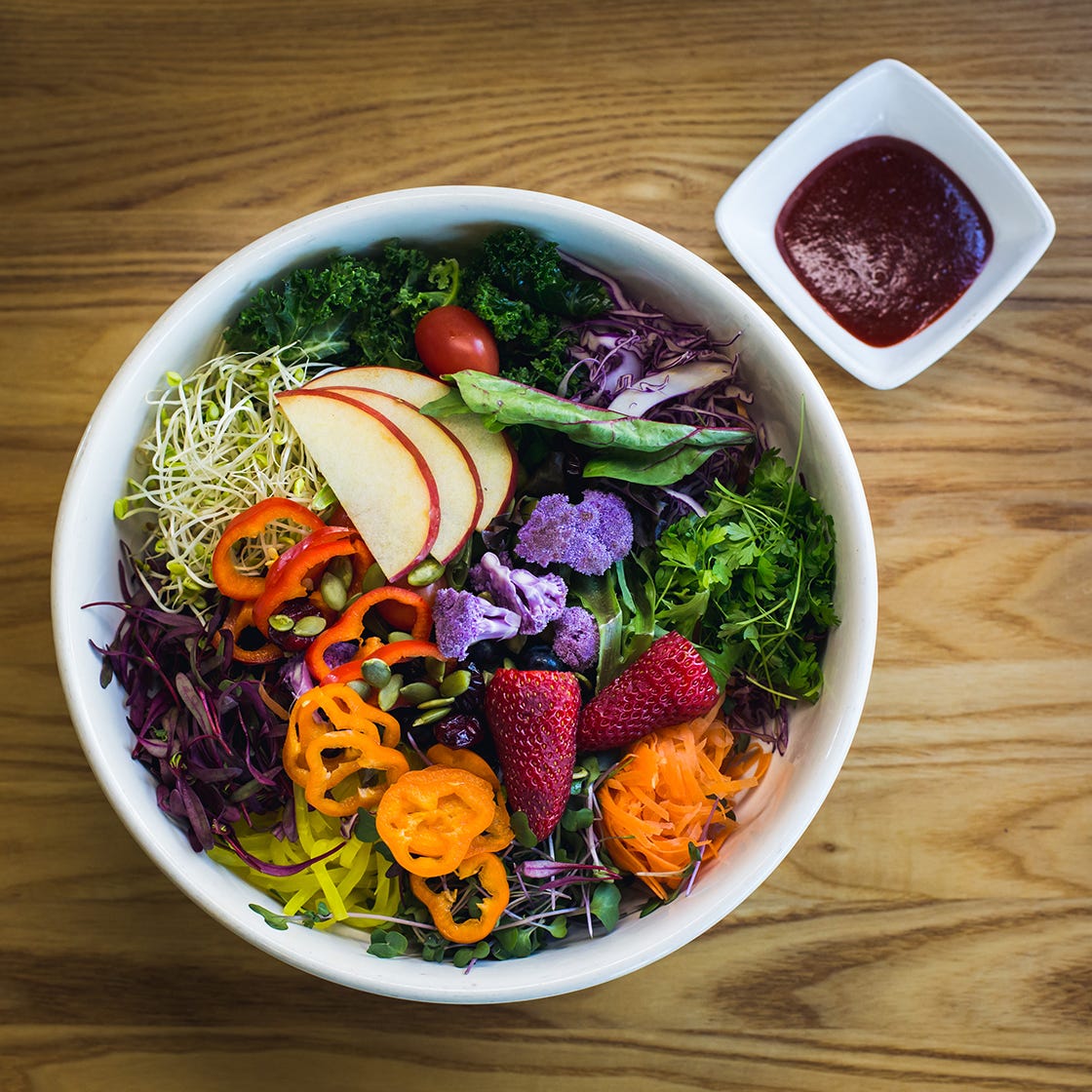 Organic Vegetarian with Mixed-Grain Rice: Showcasing raw fruits, veggies, and herbs from neighboring Berkeley Bowl West’s organic-produce section, this skillfully assembled bowl is unlike any bibimbap or salad I’ve ever had before. In fact, it tastes like neither! My recent repast included strawberries, blueberries, cherry tomatoes, apple, purple broccoli, Bull’s Blood beet greens, and bell peppers, all atop a bed of sticky, hearty mixed-grain rice. Who knew gochujang could be so fabulous with fruit?