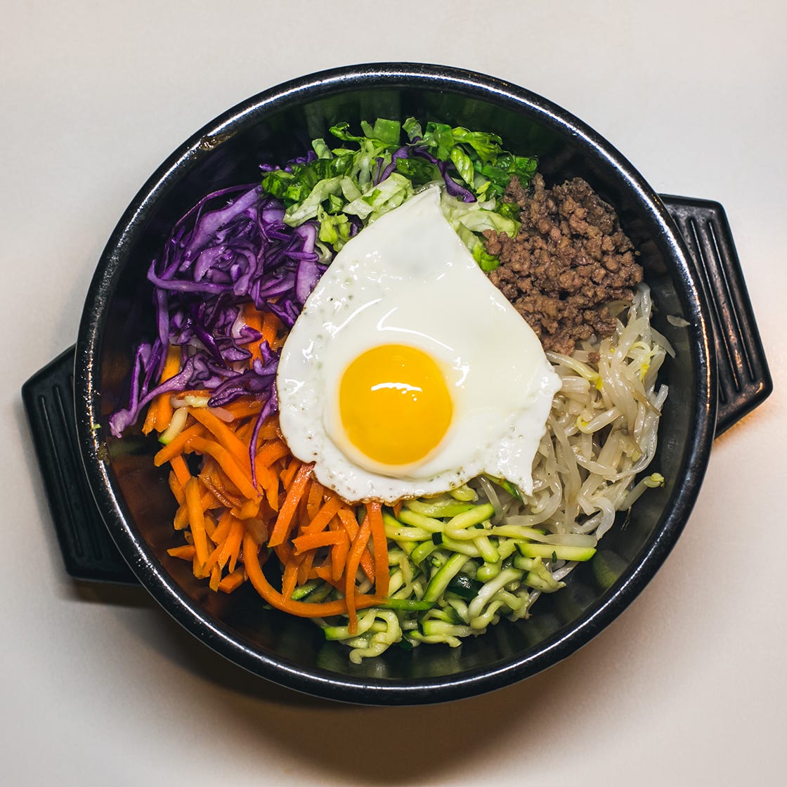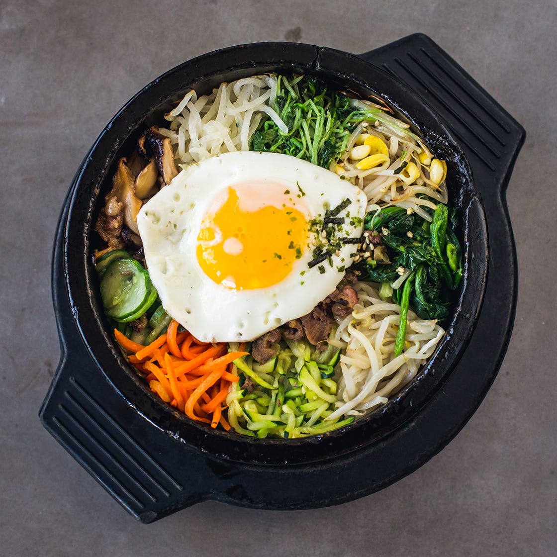 A staple in Korean households, bibimbap literally means “mixed rice.” While this filling, all-in-one meal can include practically anything (the dish is basically a way to use leftover banchan, or the side dishes integral to every Korean meal), purists expect their bowl of rice to be topped with at least three kinds of vegetables (usually sesame-oil-marinated bean sprouts, some kind of spinach-like green, and shredded carrots — all individually prepared and arranged separately); one kind of meat (typically beef); and a raw or sunny-side-up egg. These ingredients are then mixed together and seasoned to taste with generous dollops of gochujang (fermented red chili paste).