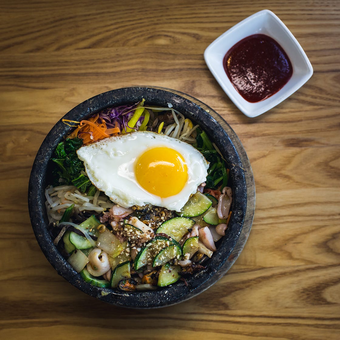Even better than regular bibimbap is having it in a dolsot, a stone cauldron that’s coated with sesame oil, filled with rice, placed in the oven or on the stove until it’s scalding, and then carefully dressed. Wait a few minutes before mixing everything together, and you’ll get a layer of crispy rice that adds a delightful crunch.