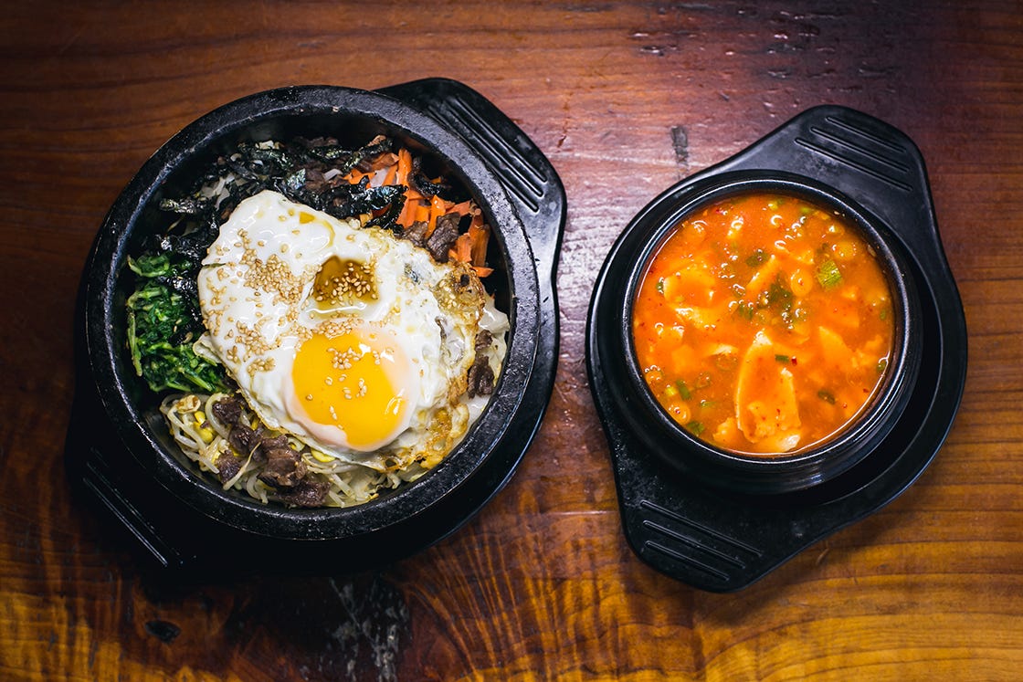Bulgogi Dolsot: This Technicolor bowl is a visual treat, with fresh carrots, red cabbage, bell peppers, dried seaweed, and zucchini offsetting the sweet beef and sunny-side-up egg. Perhaps to complement the plentiful and flavorful banchan, it’s mildly seasoned, so you can go to town with the gochujang.