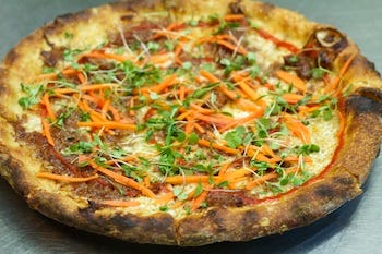 This wise-guy themed restaurant on LaCienega by the h.wood group has dimly lit booths, strong cocktails and chicken parmesan but they also serve a duck bánh mì pizza. Chef John-Carlos Kuramoto — last seen at Michael’s in Santa Monica — cures and cooks duck legs for 12 hours into a confit then layers the meat along with fontina, shredded pickled carrots, Thai herbs, and sriracha for a shockingly light and thin crusted work of art.