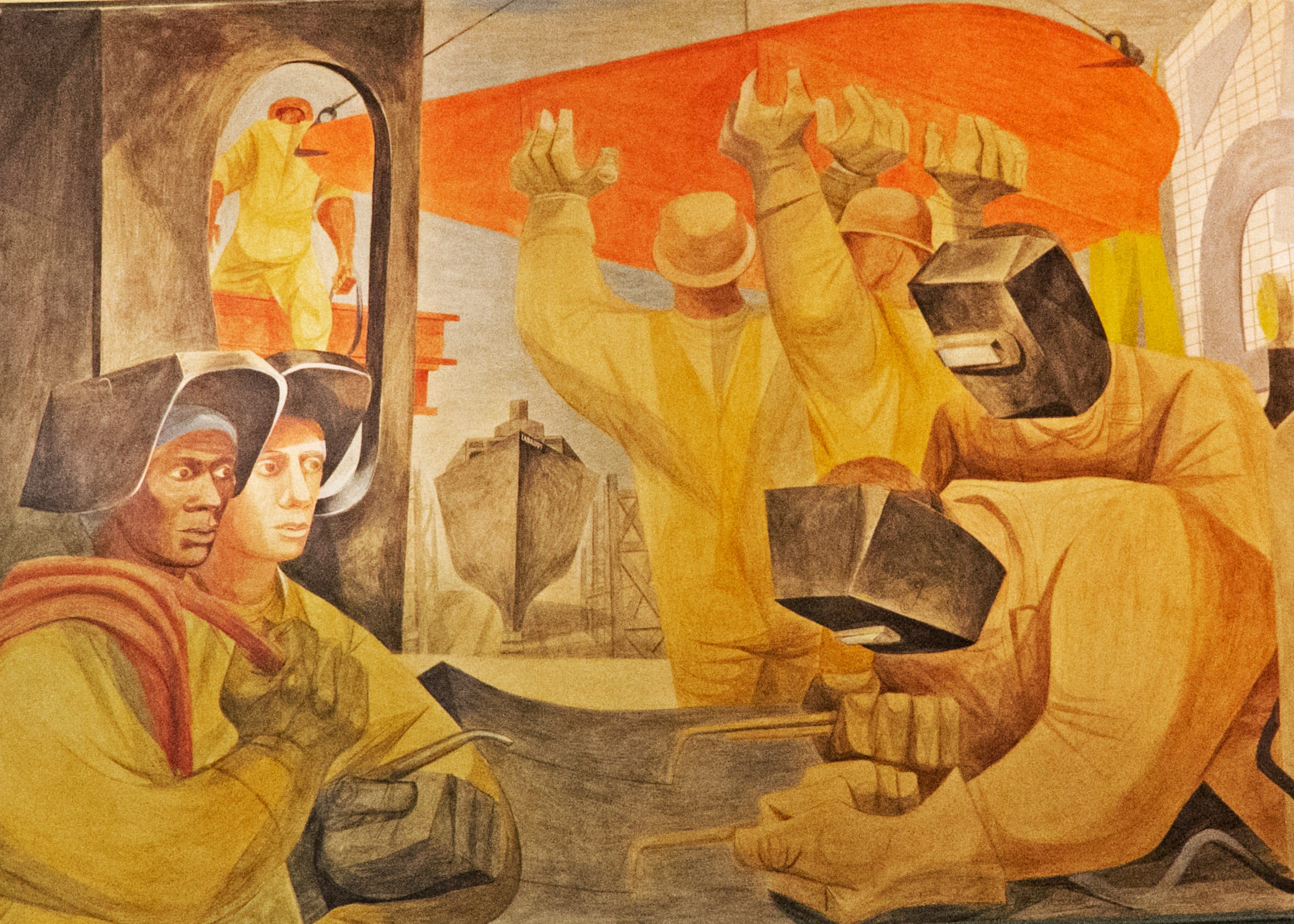 Like in the Rincon Annex murals, one sees the construction of the city, civil unrest among laborers, the founding of unions and the 1934 waterfront strike that shut down West Coast shipping from Seattle to San Francisco. In one corner, academics read newspapers, and at the top, you can just make out the headline for how Rivera was getting on with old Nelson Rockefeller.