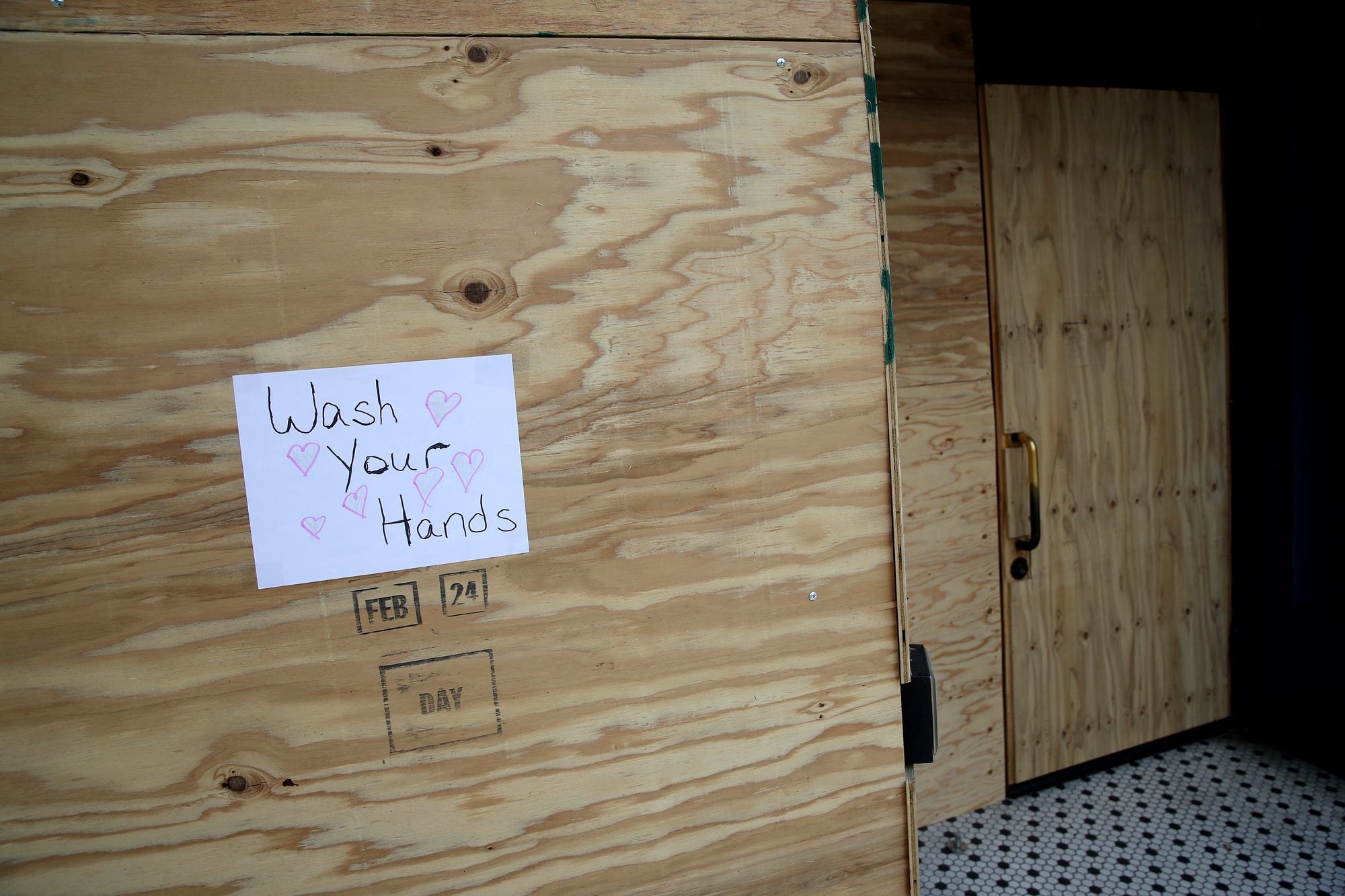 A sign posted on plywood covering the windows of a business on Valencia Street in San Francisco. Photo: Justin Sullivan/Getty Images