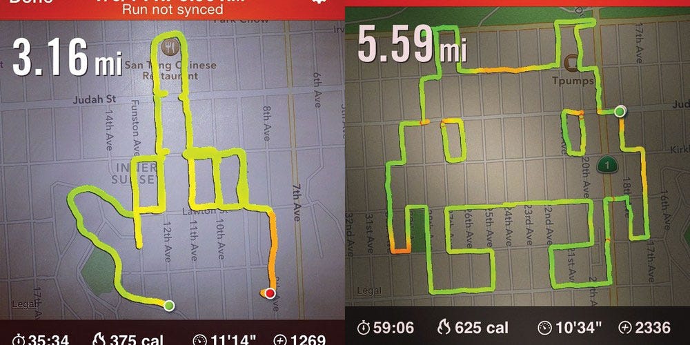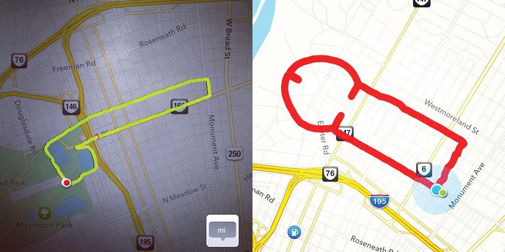 My first time … it was really special. So special. And I didn’t cry at all. I ran a Corgi, which is the best dog in the history of the world. One day I went for a run and looked at the Nike app when I was finished (it shows you a map of where you ran, after you complete a run). I kinda thought the route looked like a dog. So the next day I decided to try and make it a dog. After that my Instagram blew up. I’m talking like 60 likes. It was insane. That’s when I knew this was a thing. Then I switched to dicks.