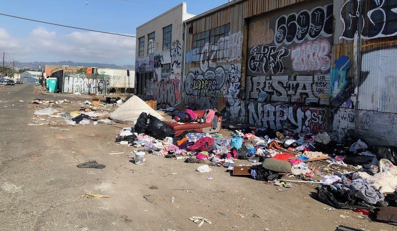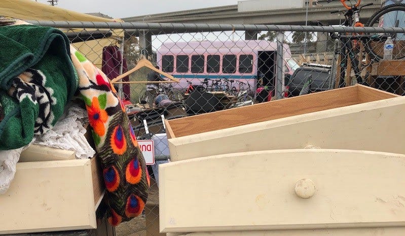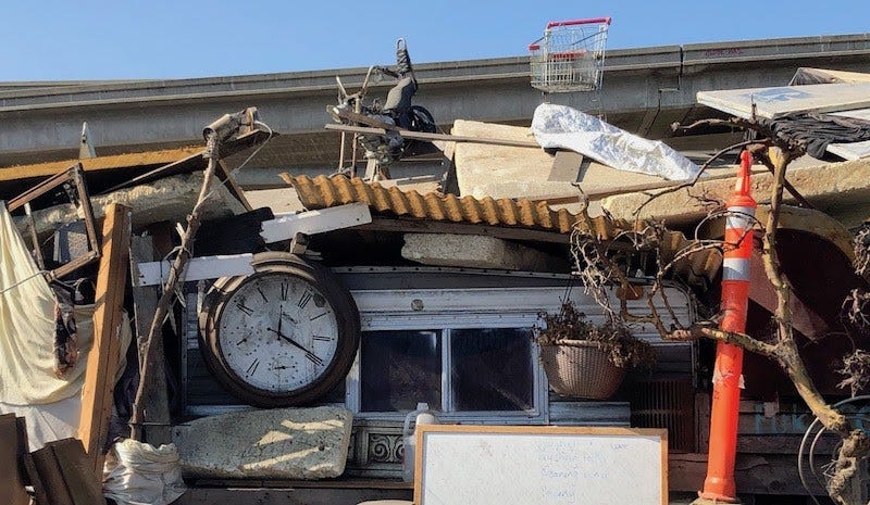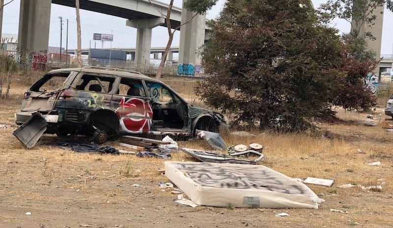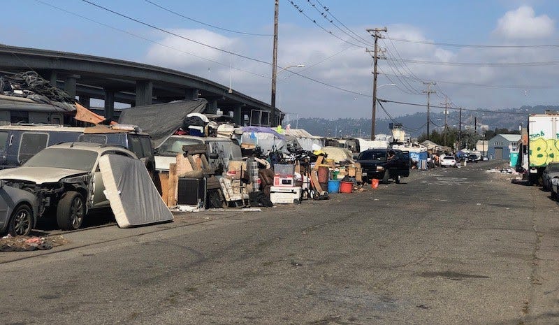 First, I visited the Wood Street encampment in West Oakland. I tagged along with some activists from the United Front Against Displacement, which is trying to build a community and political force among the homeless tenants.