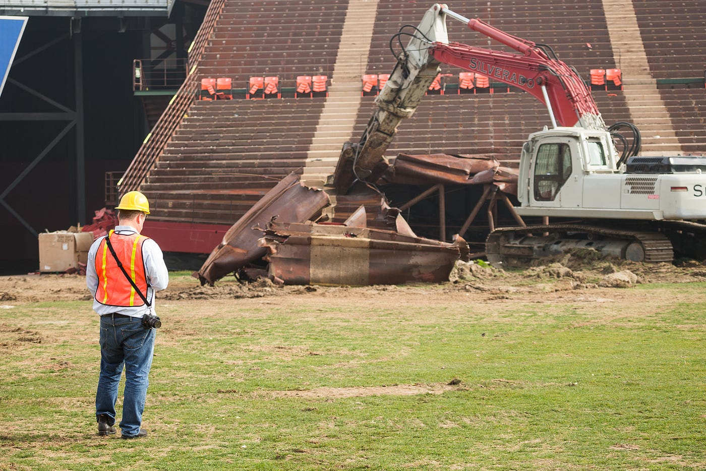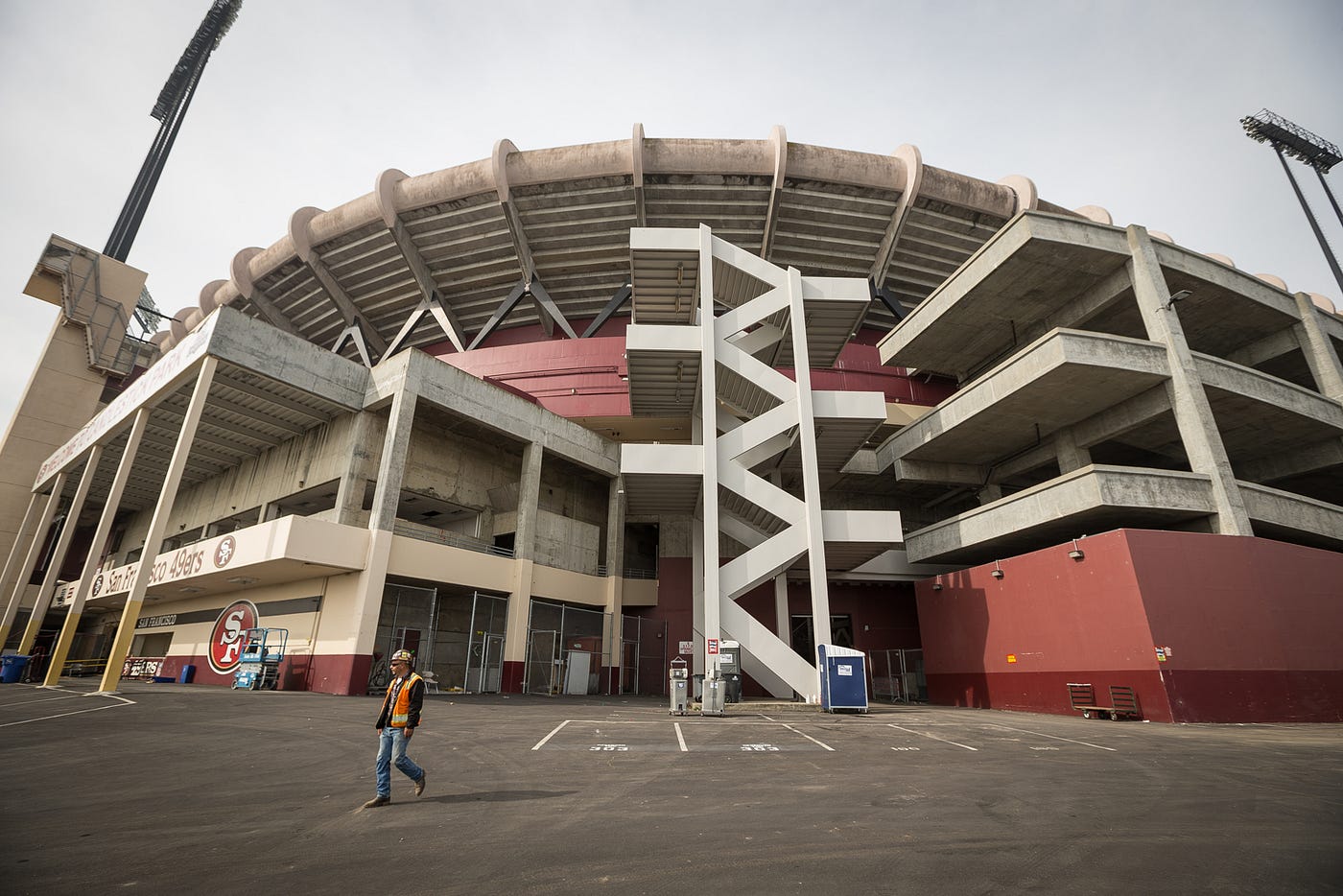 Jermaine Smith, Site Development Manager for Lennar Group, the company in charge of Candlestick Point’s redevelopment, explained that all notable memorabilia had been removed from the stadium. The main work now was removing hazardous materials like asbestos insulation so further demolition could continue. Previous plans to implode the stadium with a series of surgical blasts have been scrapped in favor of a less dramatic disassembly. Smith explained, “This is a more precision demolition. No swinging wrecking balls.” The process is expected to take about three months with cranes and high-reach excavators.