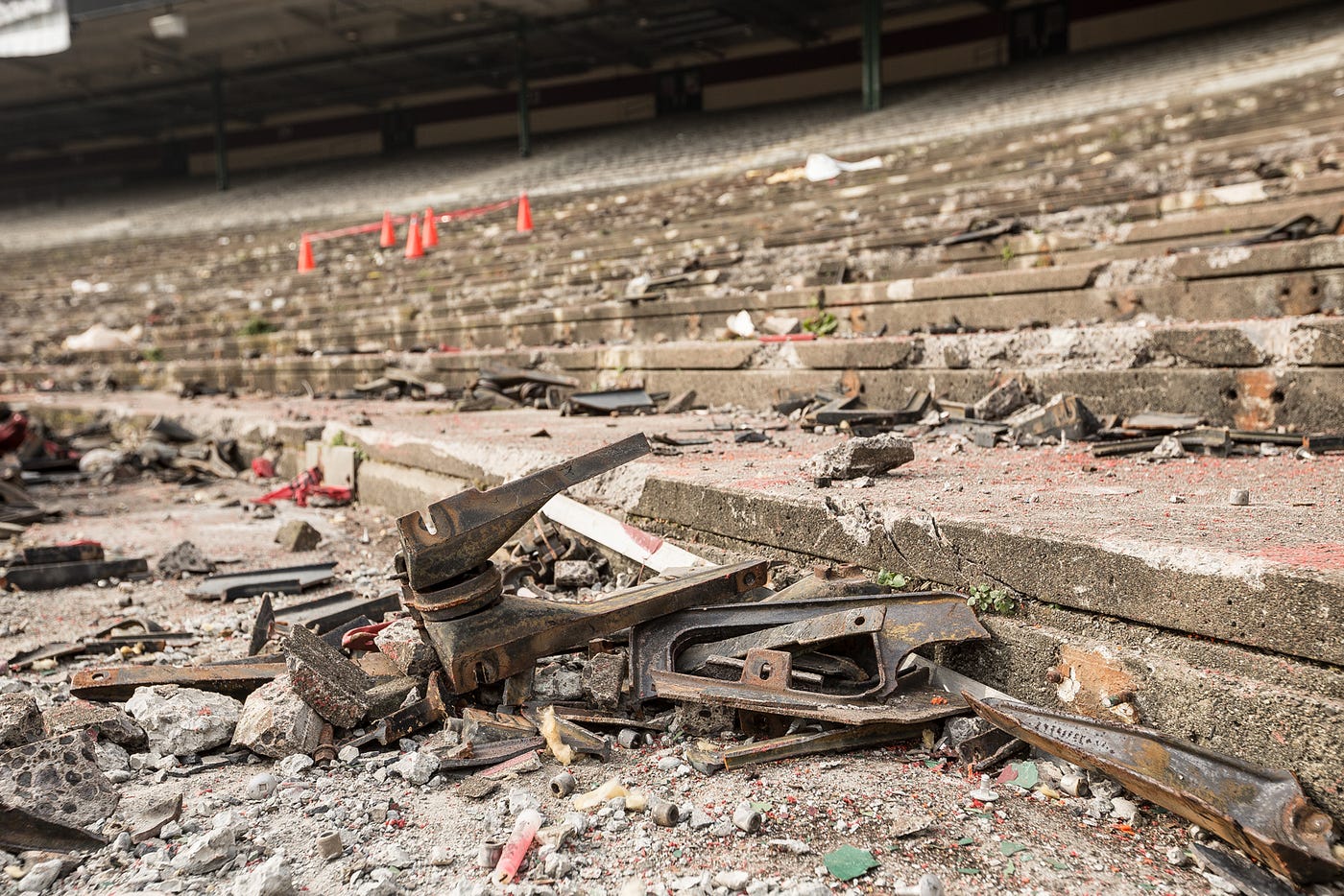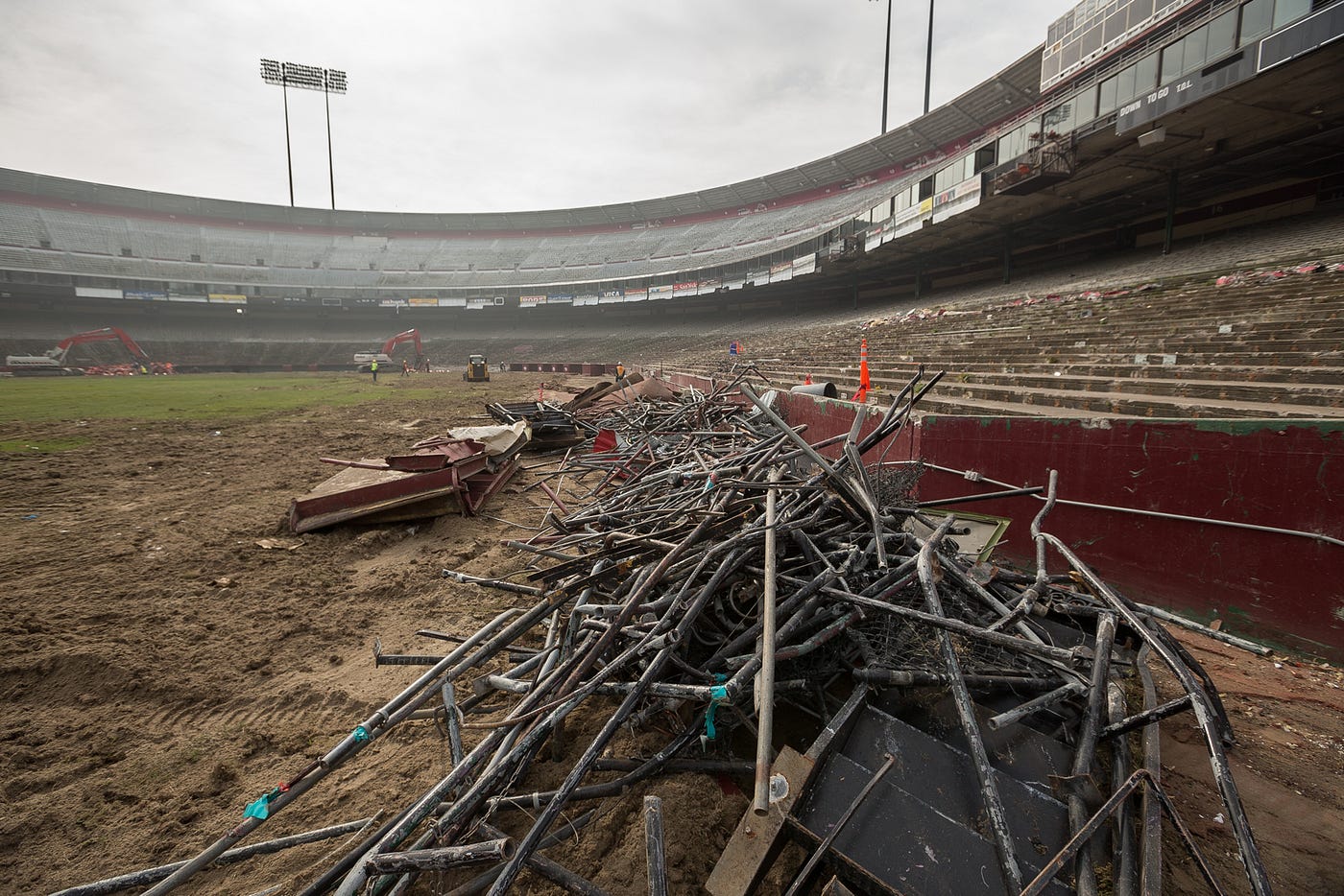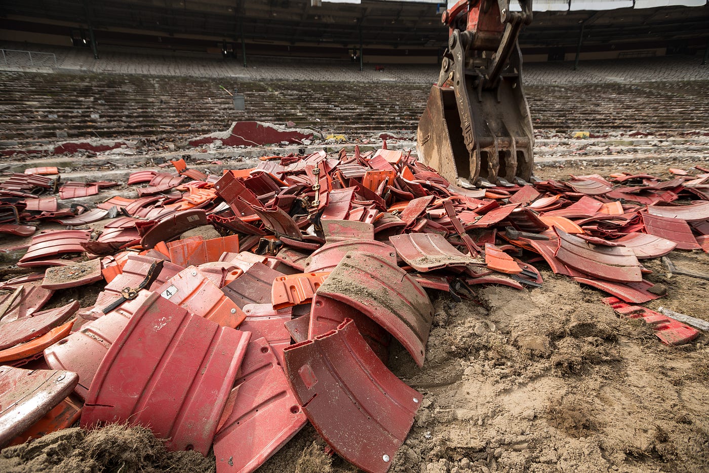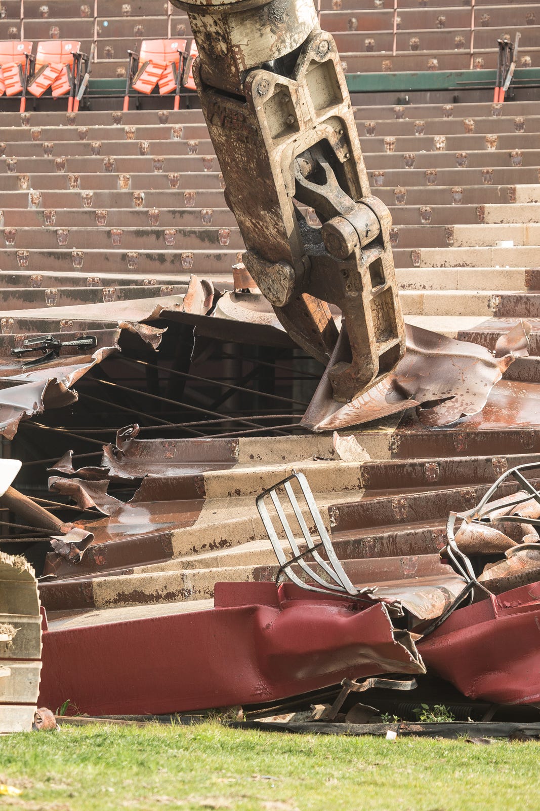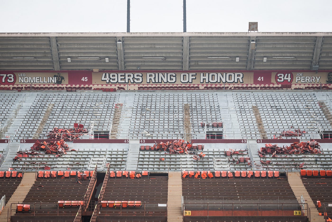 It was pretty bizarre seeing the former home of the 49ers not only empty of cheering fans, but stripped of nearly everything but the bare infrastructure. The only sound echoing around the cavernous stadium was a crane’s enormous claw tearing steel out of section 41. A few reminders of its 44 year legacy remained. Piles of seats that weren’t sold off to fans sat in the end zones and the Ring of Honor still displayed the names of 49ers greats like Joe Montana and Jerry Rice.
