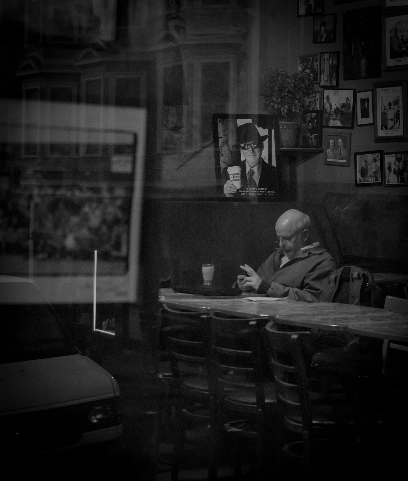 A lone patron ponders his cell phone. Behind him, the ghost of the cafe’s founder, Giovanni Giotta (a.k.a. “Papa Gianni”), smiles perennially through his Italian sunglasses.