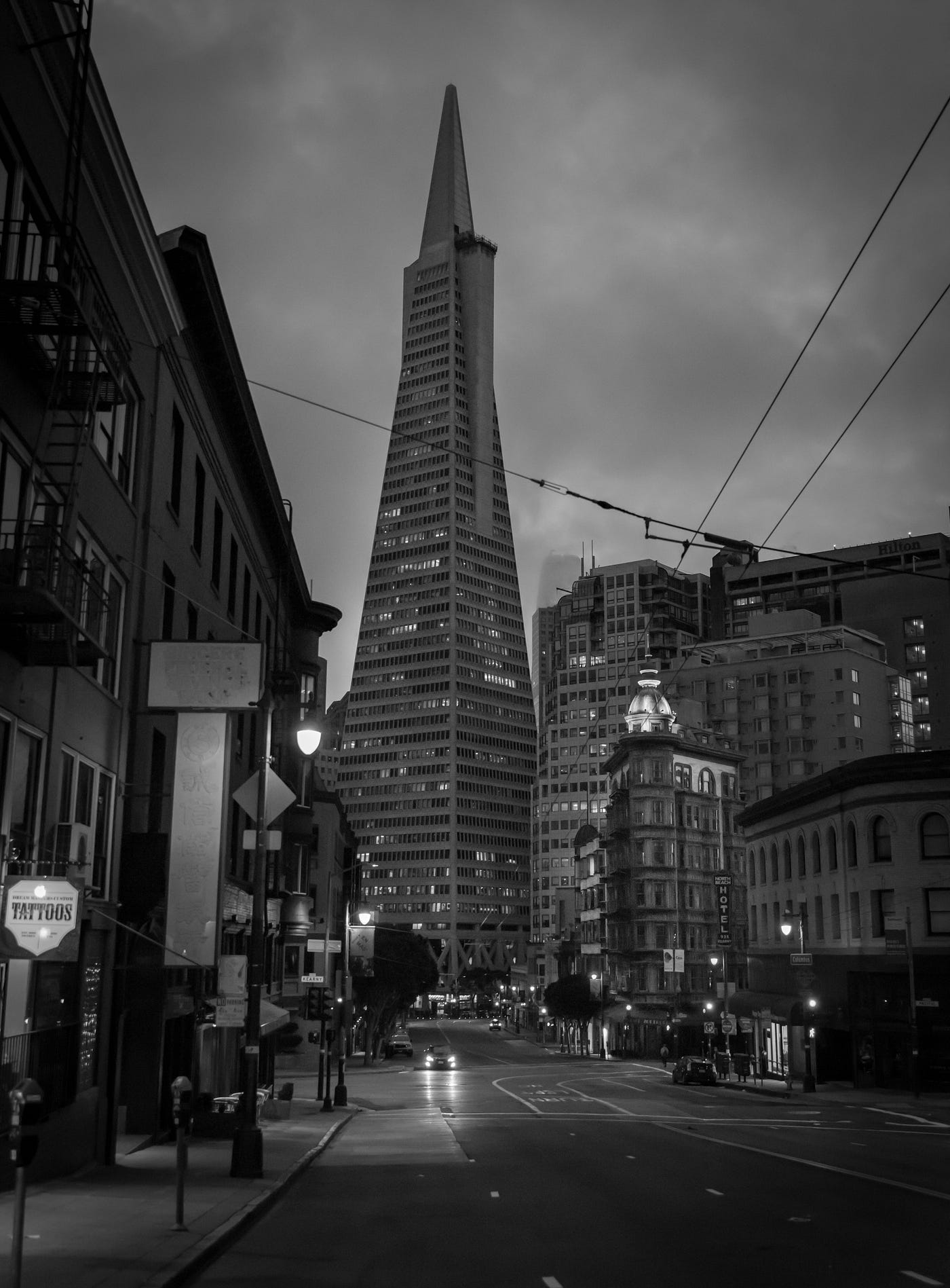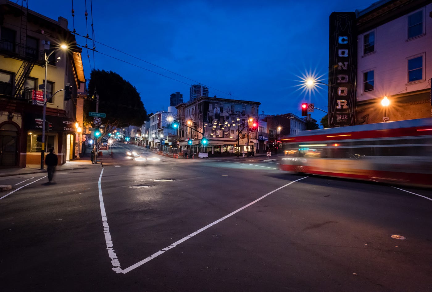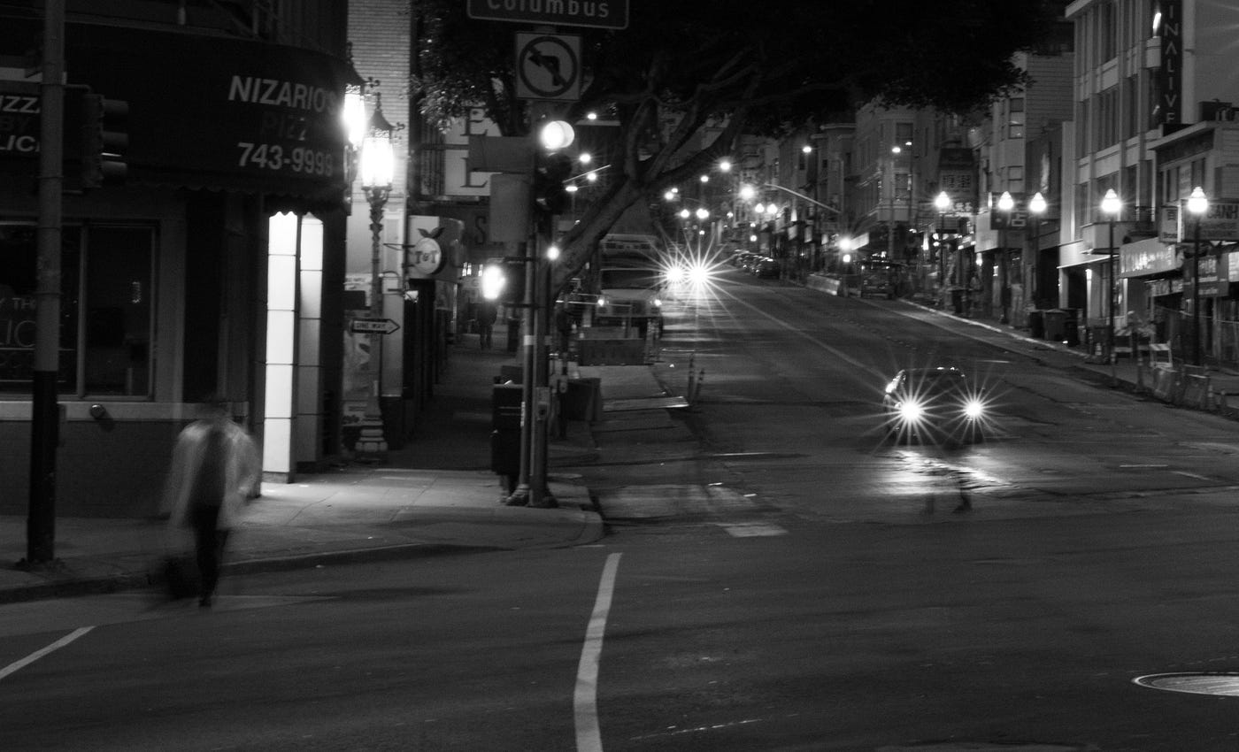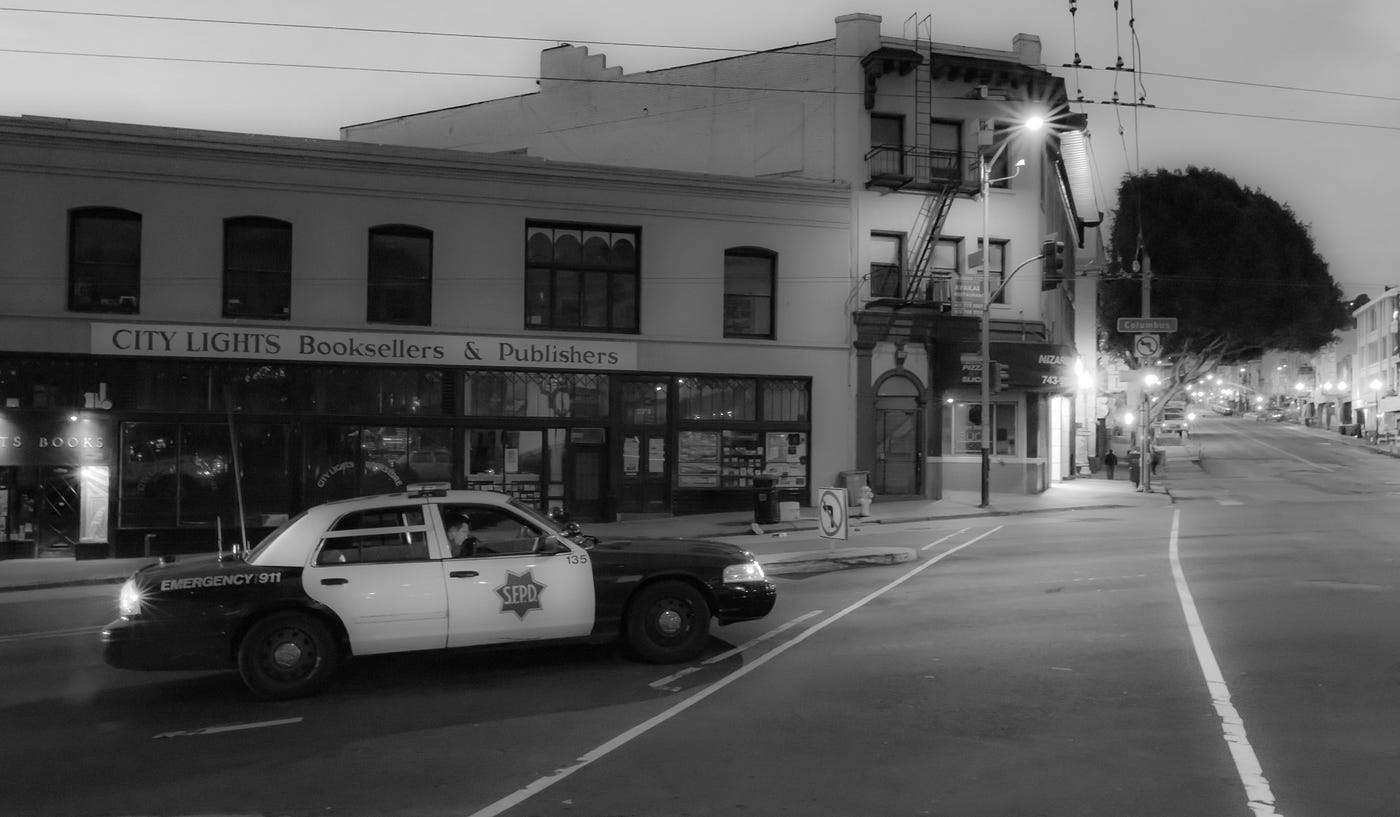 While the ’hood sleeps, a police car pauses at a red light, two cops surveying the empty dreamscape for any dark forces that threaten the Garden of Eden. An empty Muni bus rushes west through the Columbus and Broadway intersection, passing a few oncoming cars on its way through the Broadway tunnel.