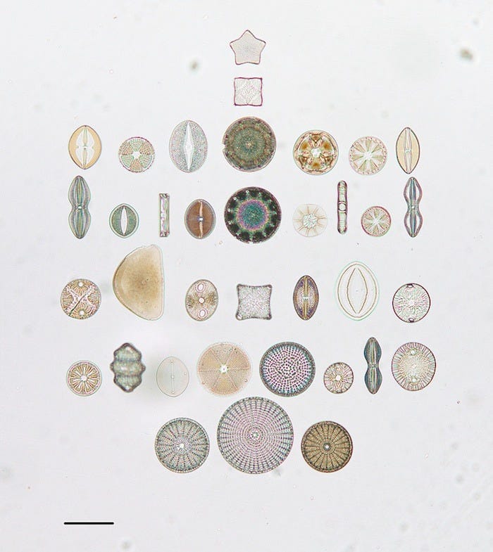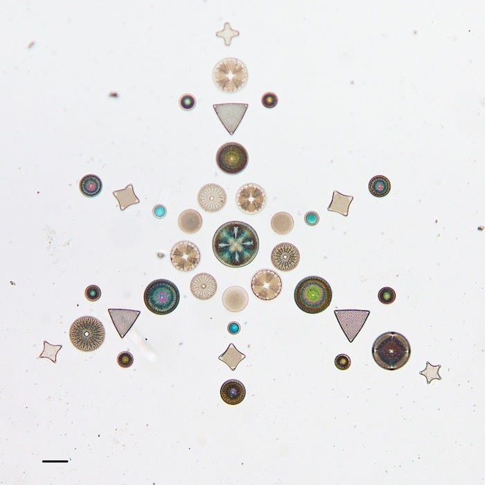 Top: Photograph of fossil diatoms collected in Pt. Reyes National Seashore in Marin County, California, and arranged on a microscope slide in 1968 by A.L. Brigger. Above: photograph of diatoms arranged on a microscope slide by W.M. Grant.