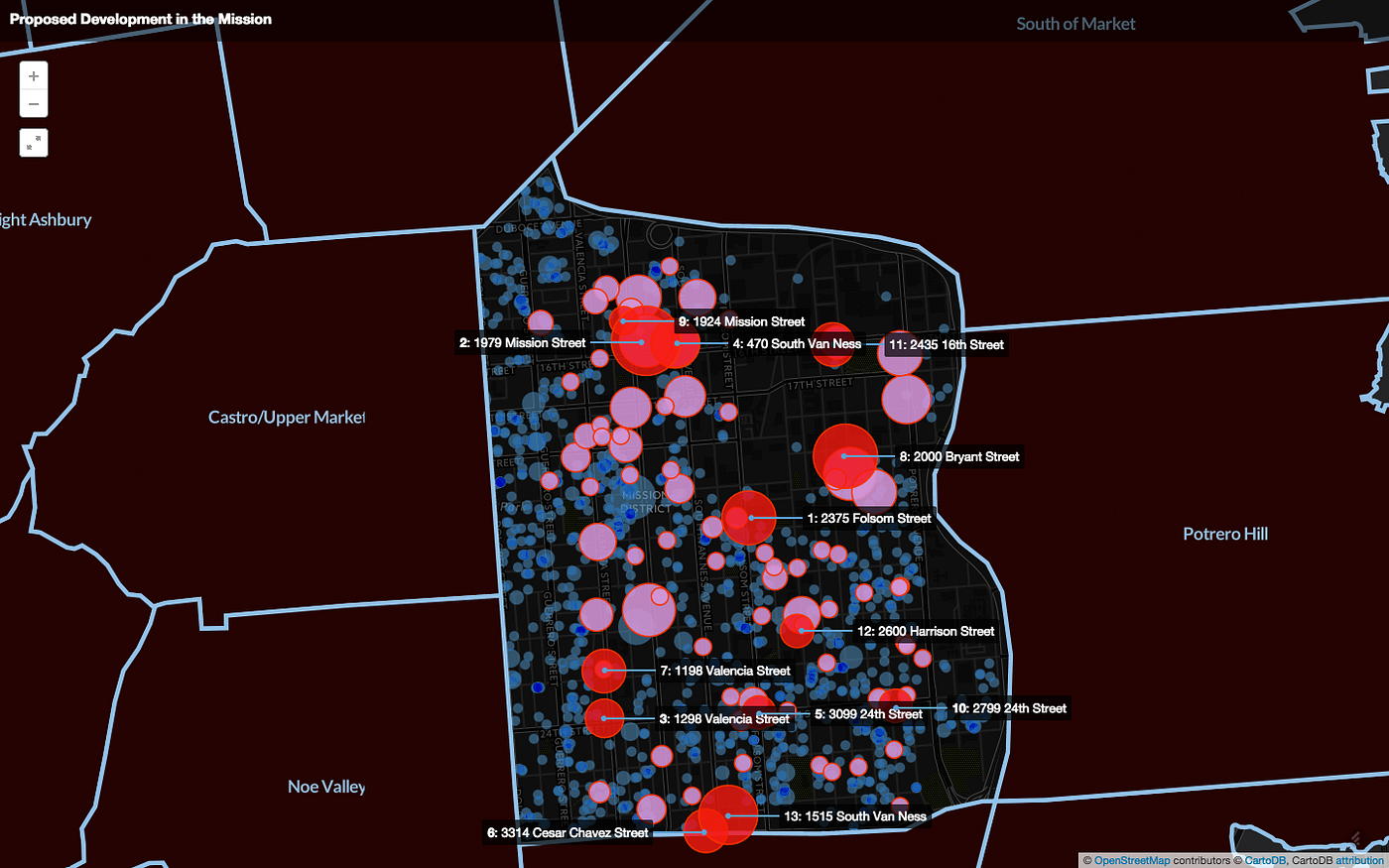 Although there’s no direct correlation noted, many areas where there is proposed and executed housing are near large areas of no-fault evictions. The map shows there’s been a total of 1,504 evictions since 1997, which include Ellis Act evictions, Owner Move-In evictions (OMI), and demolitions. The numbers will make your mouth drop: there have been 774 OMI evictions and 595 Ellis Act evictions. There’s no doubt that the Mission is losing part of its cultural heritage, and 25 percent affordable housing is not enough to satisfy the needs of those being evicted.