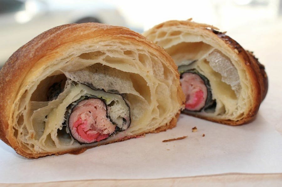 Purists, cover your eyes! Everyone else, recall our love for the California Croissant at Mr. Holmes Bakehouse, that place where thieves steal recipes instead of cash. The California is an airy croissant stuffed with nori-wrapped salmon, ginger, and wasabi, with soy sauce served on the side. Your mouth would like to meet it one of these days.