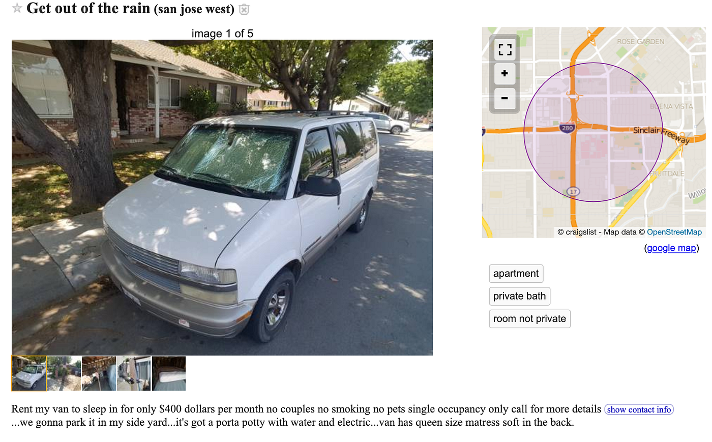 Our monthly series on rental horrors across the Bay Area continues, this time with a tip from a TBI reader who tweeted a posting from Craigslist about a rental—if you could call it that—in San Jose. The listing offers a broken-down minivan parked on the side of a road for $400 a month with an inflatable mattress, plus an extension cord to plug in a lamp or phone charger. “It’s got a porta potty with water and electric,” the listing reads.