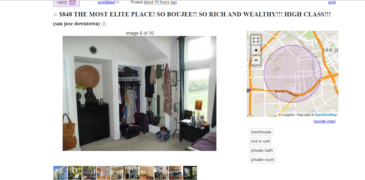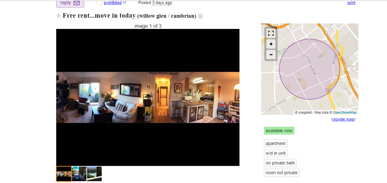 The listing boasts that the house is located in one of the most “affluent” neighborhoods in San Jose. The poster claims that most of the photos are stock photos provided by the homeowner’s-association site, and the blabber goes on and on and on. This has “SCAM” written all over it. I wouldn’t go see this place alone.