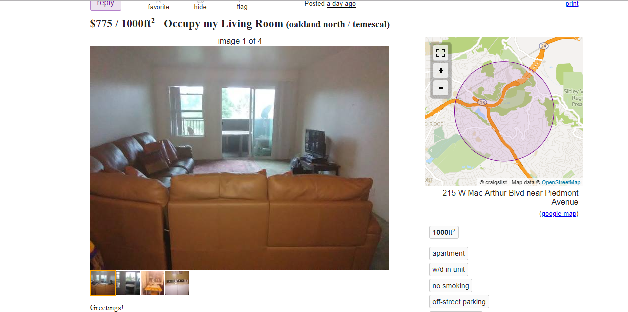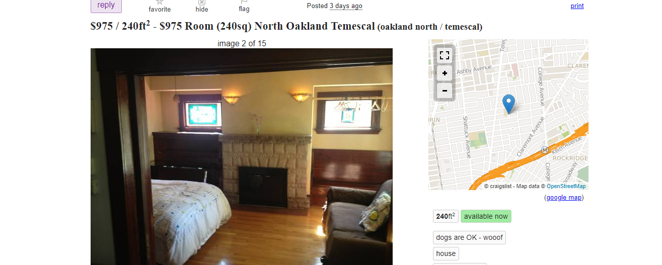 If you’re interested in the coveted Oakland neighborhood that is Rockridge, then this living room is for you! Who needs a closet or a wall to divide your sleeping quarters, not when you’re close to Ashby and Rockridge BART stations. While the poster doesn’t advertise the space as a living room, the pictures make it clear that that’s what you’ll be renting for $975 a month; the fireplace is a dead giveaway.