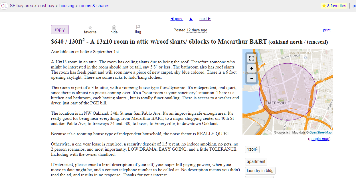 There are no pictures of this attic turned bedroom, but the post indicates that the roof is slanted. So if you’re taller than 5’8, this one is not for you—but to be fair, it’s extremely affordable, at $640 a month. The ad also indicates that the “room is part of a 3 br attic.” Does that mean that all three rooms are part of the attic? It’s unclear, as the ad doesn’t really specify much about the actual room itself other than that the roommates have low tolerance for drama.