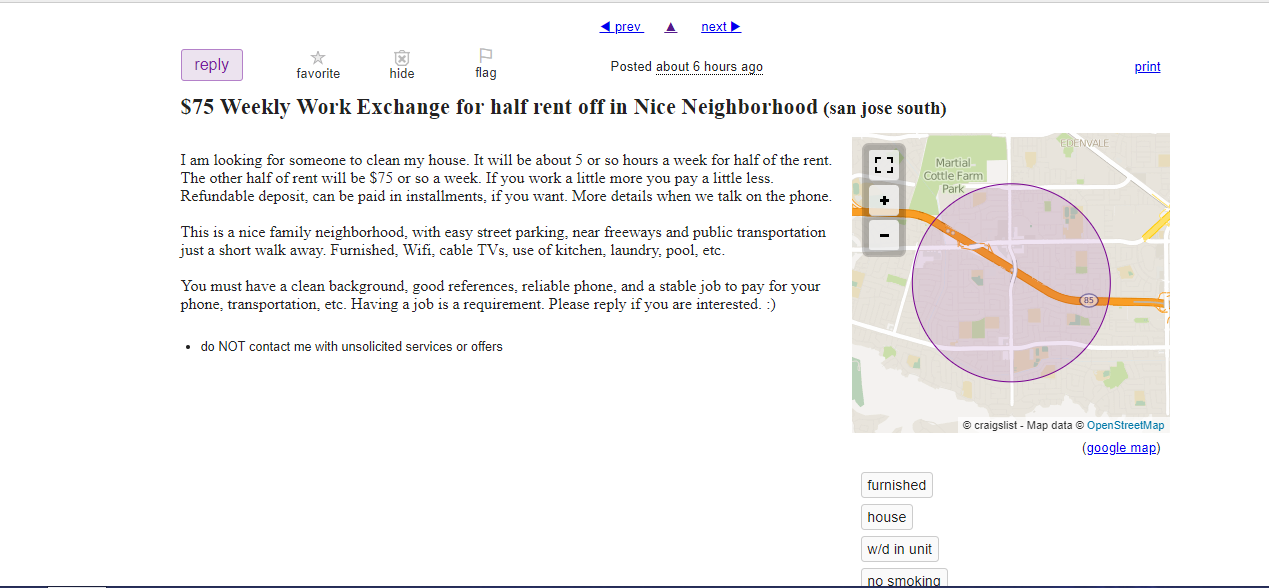 The person who posted this ad needs house-cleaning help for about five hours a week. In exchange, your weekly rental rate is $75. You get to use the kitchen, the laundry, and even a pool. As with many of these “cheap rent in exchange for labor” ads, there are no pictures of the room, no indication of who your roommates are going to be, and no description of what kind of house-cleaning duties are needed. This free/cheap rent situation has become a common theme, though the legality of it remains a gray area.