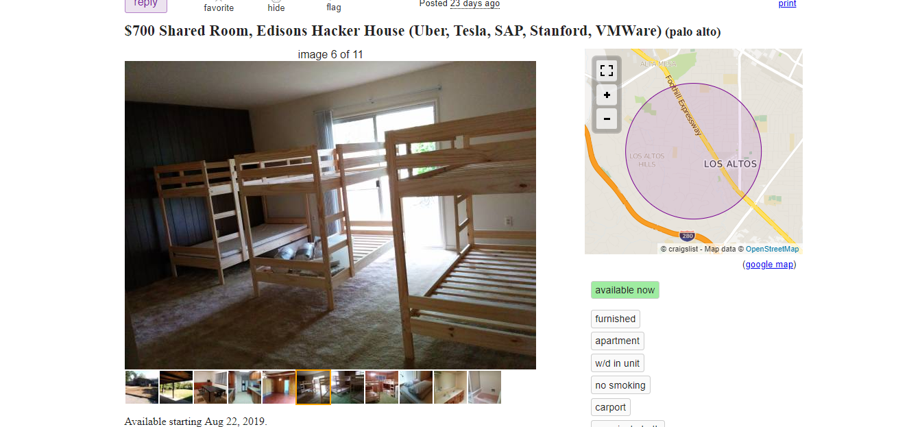 For years, these communal bunk-bed rooms — a.k.a. “hacker houses” — have been popping up in various areas around the Bay Area. In most cases, you’ll share a room with four to six other roommates, each one with their very own bunk bed. The total number of actual roommates depends on the number of rooms the home contains. The rest of the home is shared by all those who live there. If you rent this particular space, the owner asks that you think before you cook: “No hard smell cooking (curry, fish, etc.) since ventilation is not that great, and we share all the utensils/appliances you need,” the ad reads.