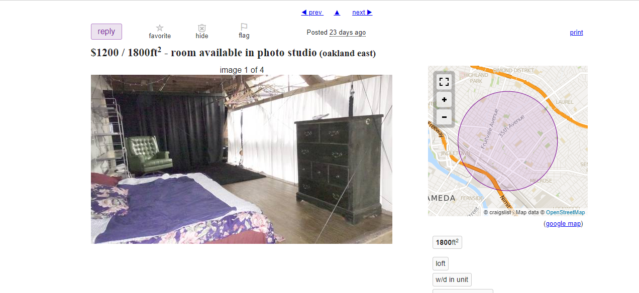 Every once in a while, commercial spaces pop up in the Craigslist rental section pretending to be legitimate housing rentals. They are often art spaces. This ad offers a makeshift “room” within a photo studio in East Oakland where photographers and aerial dancers work. All that separates you from the business side are two curtains that serve as “walls.”