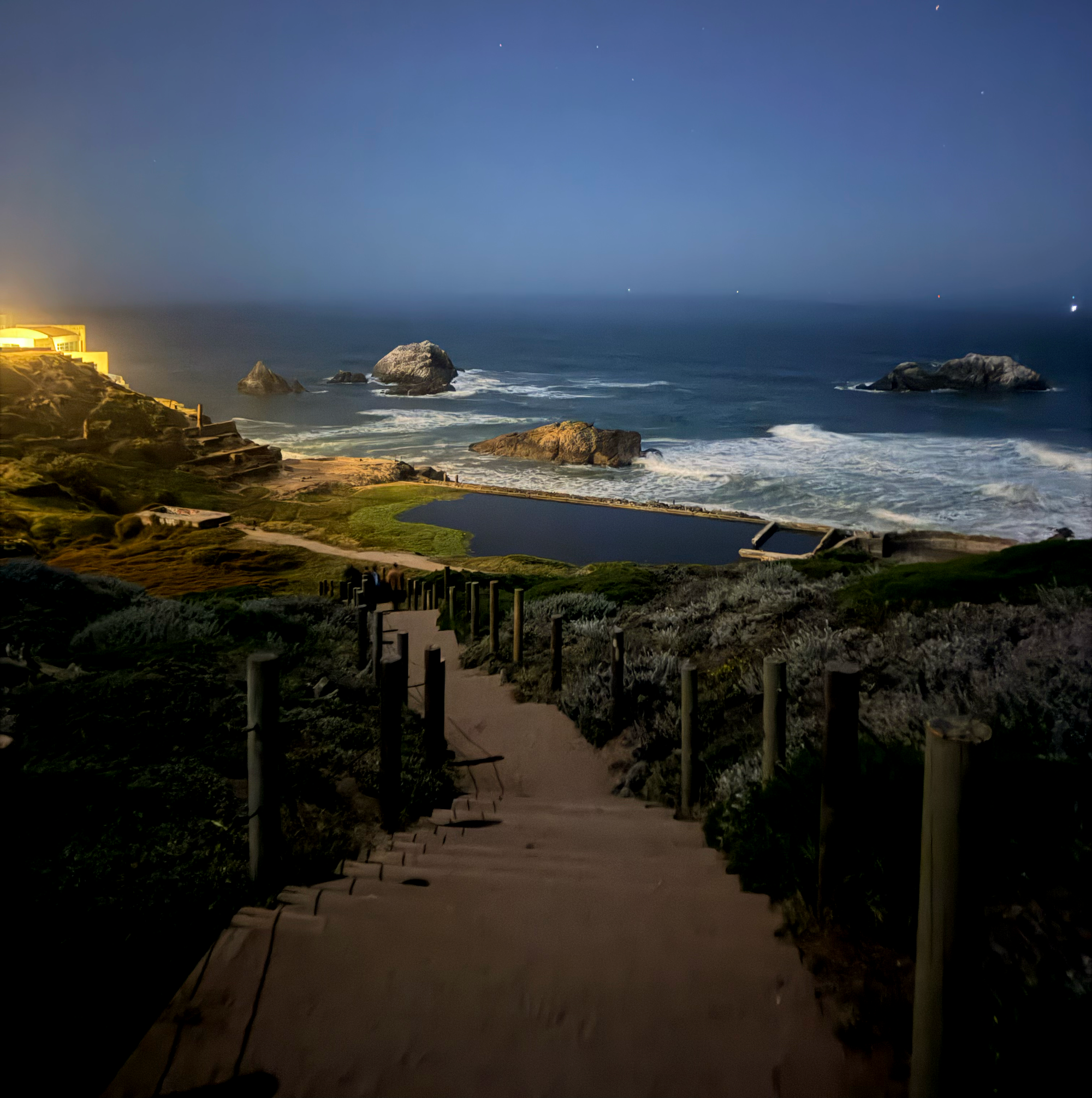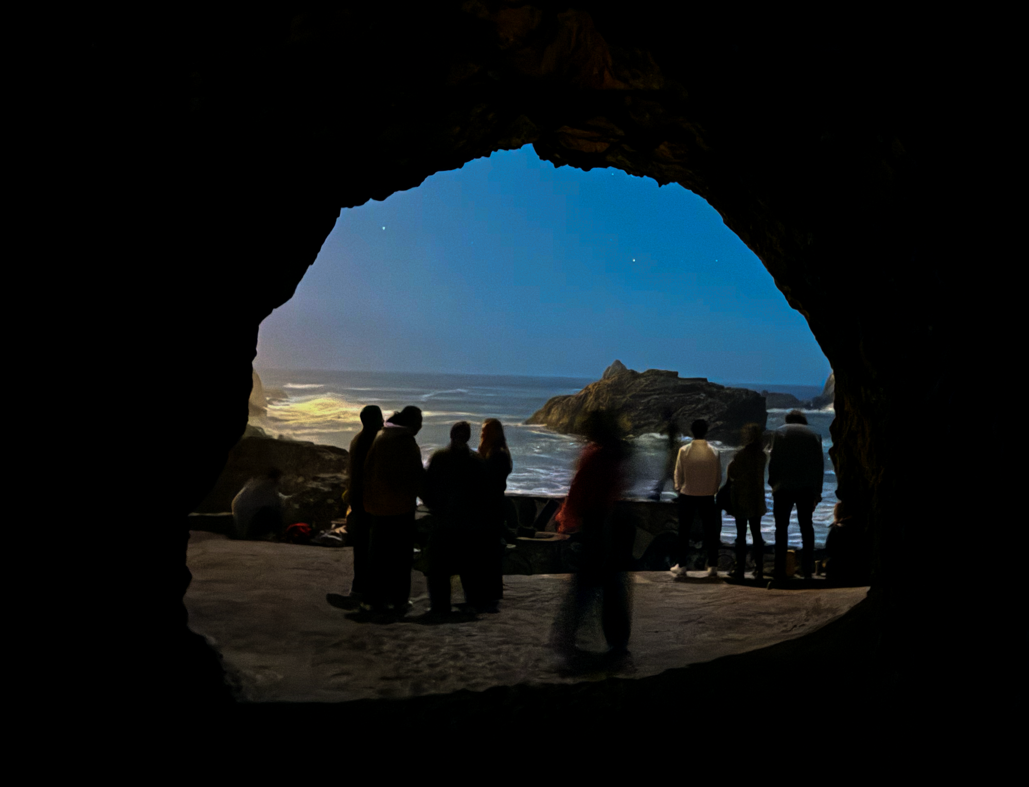 Last night, we all "snuck" down the stone staircases and winding paths at Lands End. People entered a well-known cave next to Sutro Baths; one that's scrawled with a neon evil eye, a skull, and other graffiti from hikers and partiers over the years. If like my group, you made it early, several instruments played in what I thought was turning into a blood sacrifice.