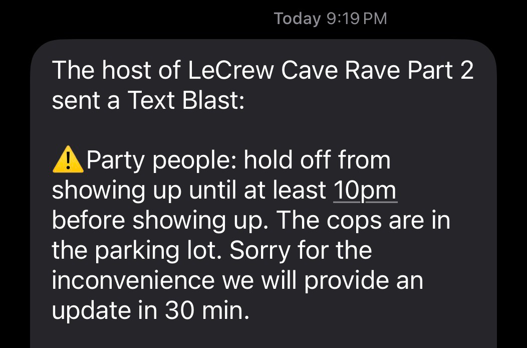"There must be another cave nearby," my friend said. There wasn't. In fact, this was the same cave they partied in 2024. That the "secret location" was exactly the same — and yet, not disclosed until the day of the event — made me giggle a little bit.