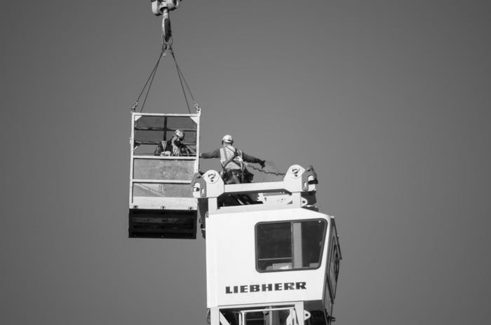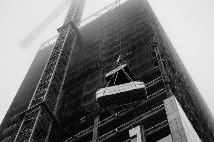 It was only three months ago that I photographed my first crane in Hayes Valley, but that one is already long gone. The building it was erecting is getting its final polishing. I found new cranes, though, in the following weeks. I took them apart with my camera, focusing on their joints and hooks or just waiting for the right moment to capture an operator having lunch up high. For me they represented the border between monstrous and beautiful, the lofty aspirations of “new San Francisco” and the bulldozing development it brings.