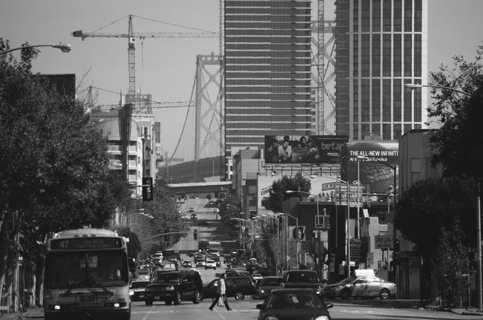 I caught my first San Francisco crane on camera while meandering though Hayes Valley looking for things that teased my eyes. There was something about that giant steel arm swinging over all the small converted houses, jutting up against the clear blue sky. It reminded me of that old painting of a smoke-billowing steamboat pulling a sailboat in to be dismantled. The painting portrayed the dawn of the industrial era, and in many ways the cranes dotting the San Francisco skyline represent a new era of their own.