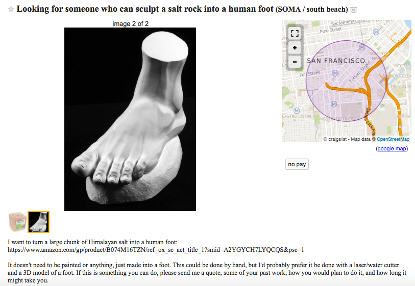 The Bad: You have to make a foot from Himalayan salt, preferably with a laser cutter—all for no pay. It says to send a quote, but I think they just mean an inspirational one to look at each day you’re carving a foot out of salt and questioning your fine-arts degree.