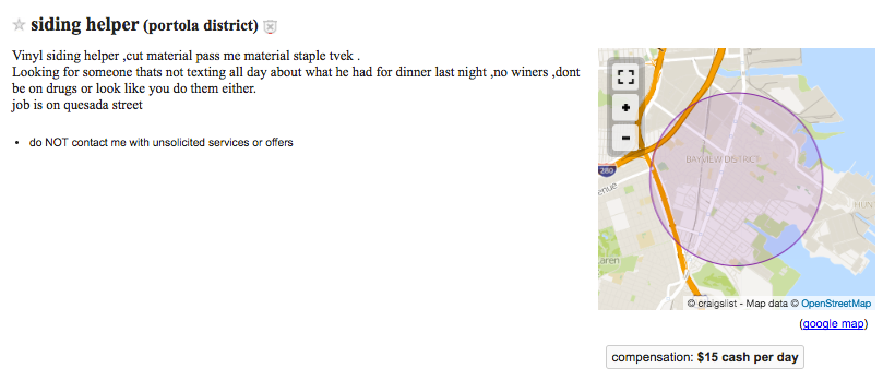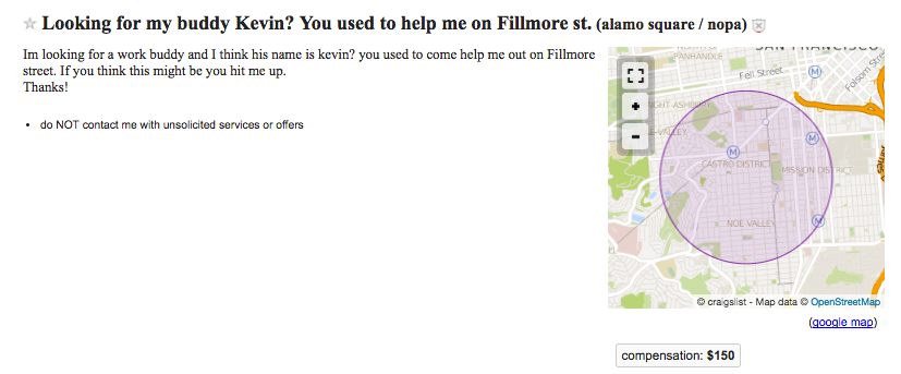 Just because this series has taken a short hiatus doesn’t mean job posters in the Bay Area have gotten any less desperate. This month, we’ve got people looking for ladies (but only because the doctor ordered them), weed and Kevin. Let’s see how the gig economy has now become the go-to method for finding kinship.