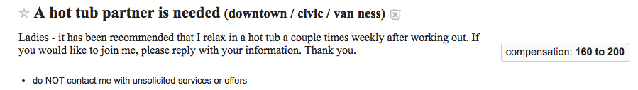 The Good: You’re getting paid decently to just be in a hot tub. I assume the range in compensation depends on how much you nod your head in agreement with whatever the person who posted this ad is saying.