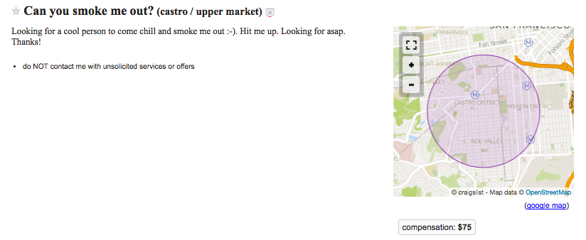 The Good: The ad doesn’t specify how much weed is needed. Since this person doesn’t seem to be hip to how things work, I think you could get $75 to split a joint and listen to their Rick and Morty conspiracy theories, which is pretty good money.