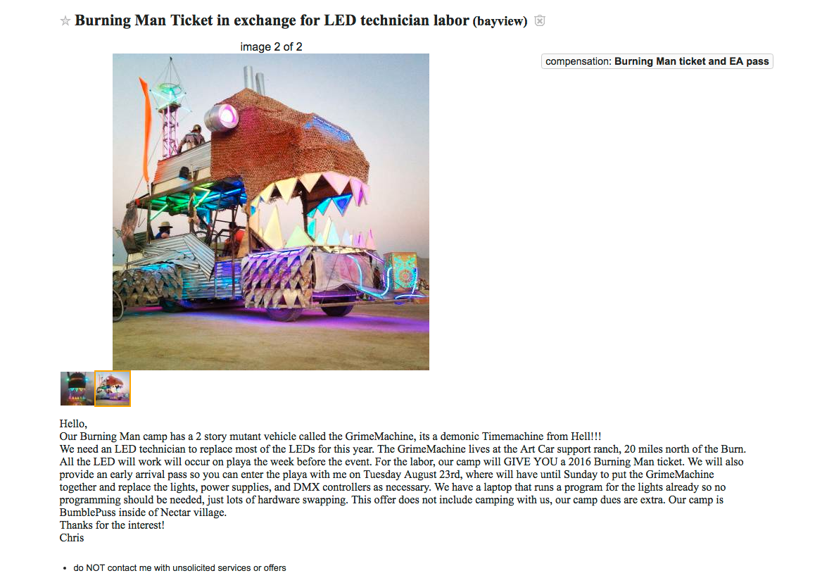 What: The most Bay Area thing I’ve ever seen. If you’re an LED technician, this group of Burners needs someone to change out the lights on their “2 story mutant vehicle,” and you will be paid in the form of a ticket to the Great Festival itself.