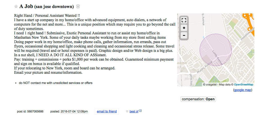 What: That’s such a brief title for such a long list of requirements. “Submissive, Exotic Personal Assistant to run or assist my home/office in Manhattan New York.” And what does that entail? Administrative tasks, travel, sales, cooking, cleaning, marketing—oh, and if you’re good at web design or graphic design, that’s a plus.
