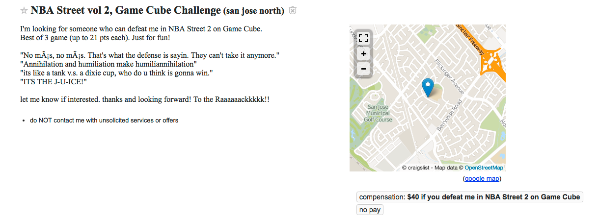 What: This isn’t so much a job as a challenge, but it was in the jobs section of CL, presumably because it will require much work to succeed. NBA Street Vol. 2, a game that was released over 13 years ago, has a self-proclaimed champion who’s offering a whopping $40 to anyone who can defeat them.