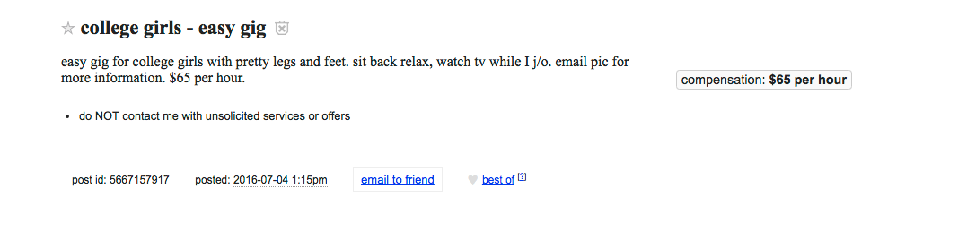 What: If you’re a college girl with nice legs and feet, this guy will pay you $65 to “watch tv while I j/o …”