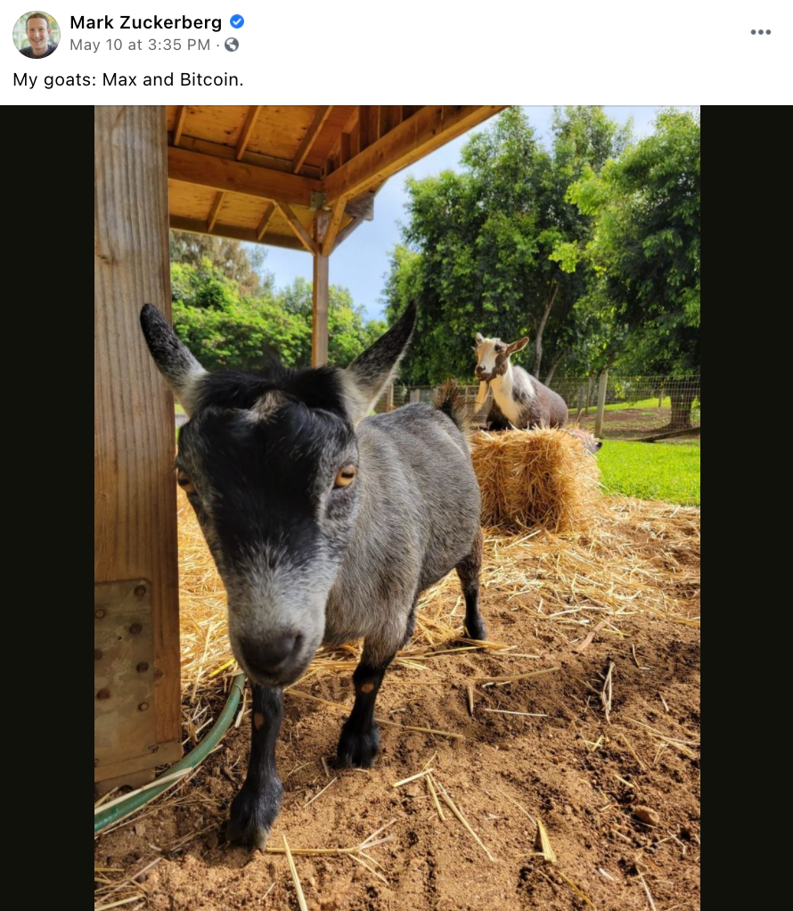 May has been a hard month in the digital money space. Most cryptocurrencies have tanked faster than you can say, “whip me Elon Musk.” With complete disregard for the current pup-focused blockchain shenanigans (in the battle of Shiba Inu vs. Dogecoin, may the best barker win) The Zuck has, with all his usual sense for inappropriate timing, shared a **wonderful** picture of the new additions to his household; Bitcoin and Max, two lovable horn-free goats. Max Bitcoin? Yes, well…