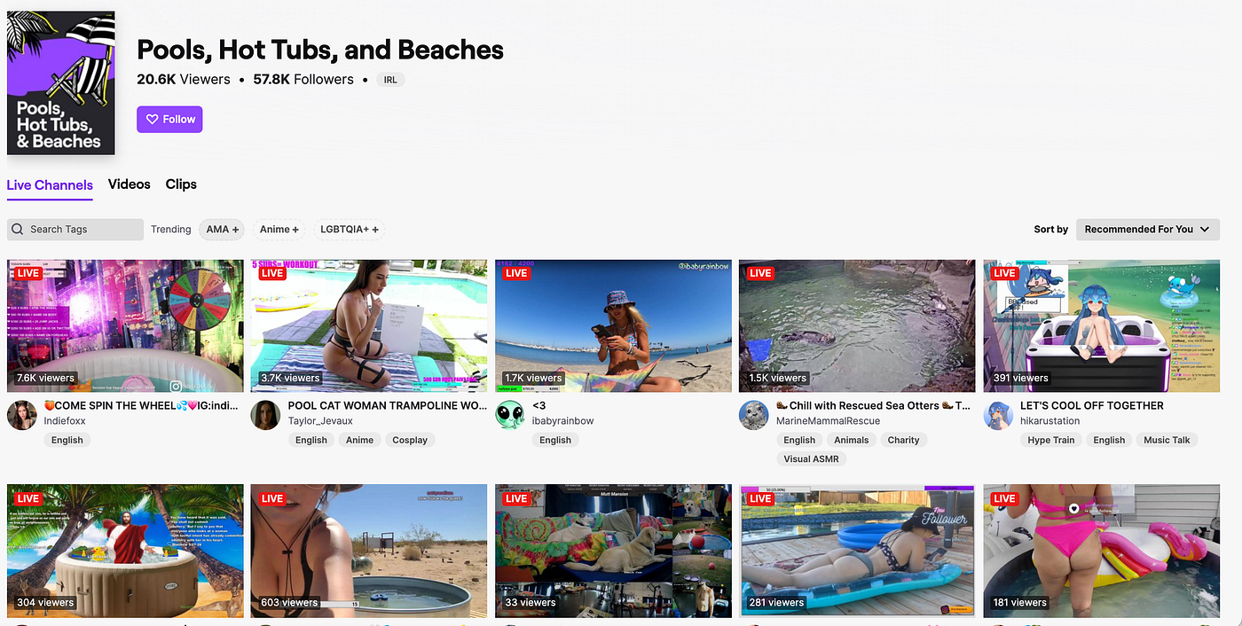 The move is a reluctant one by Twitch, forced by gaming streamers gaming the system (no duh!) by playing from their paddling pools and tubs. Essentially, gamer girl or boy plus bikini = high view count. The problem for Twitch was advertisers, many of who were happy to promote their brand via kids massacring each other in Call of Duty, but got squeamish when the same kids show off their bruised skin. At first, Twitch just removed some of the ads, claiming they received complaints from advertisers and viewers, but after push back from their creators (and their fans!), announced the new hot tub channel. To be sure, Twitch’s rules nix any “sexually suggestive content” but the mere bathing suit doesn’t fall into that category, and Twitch has promised to protect their state of undress as long as it stays SFW — no nip slips allowed.