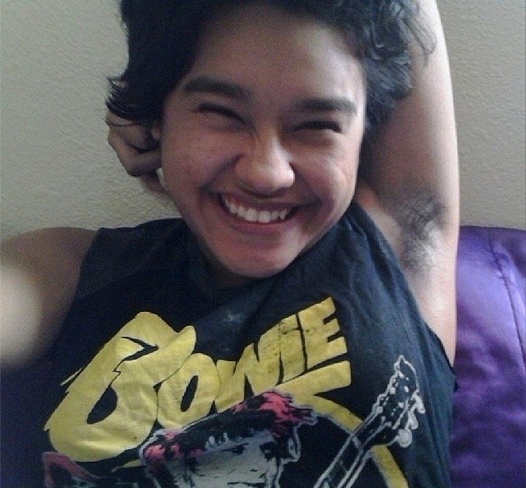 I get a lot of hate. Comments, mostly from teenagers who feel they have the right to post “ew” and “nasty” all over pictures of confident ladies. Honestly when I was 16 I thought armpit hair was gross. I didn’t give up shaving until I was 20 and comfortable with myself. I also had an awesome group of feminist friends and I realized I didn’t need to shave. Why should some people get to have all the fun shaping and growing their facial hair into ridiculous shapes but if you identify as a lady you aren’t allowed to have a little tuft of pit hair? It grows naturally from my body, and I like it as much as my head hair. I challenge anyone who’s never seen their body hair to go a month without shaving. You just might like it.