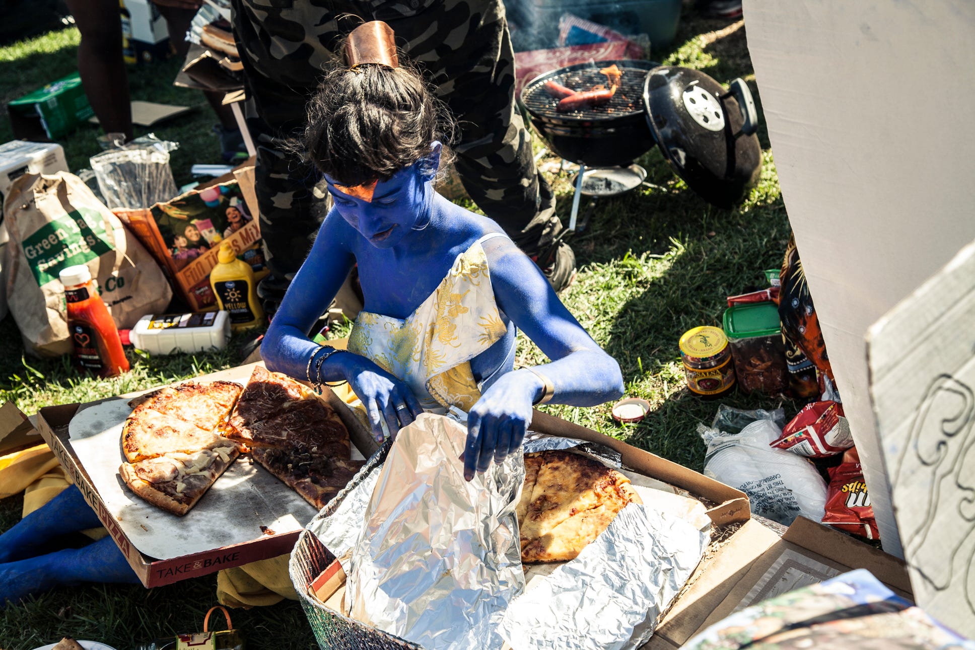 I thought this woman was dressed as Shiva, but she told me she was actually the “genie of pizza.”
