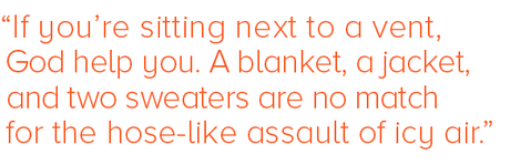 All the busses are kept at a constant 75 degrees, and the temperature gauge is perpetually broken. If you’re sitting next to a vent, God help you. A blanket, a jacket, and two sweaters are no match for the hose-like assault of icy air. Halfway through one trip, I gathered all the trash I could find and crammed it into the open vent, blocking it just enough to fall asleep despite my shivering and teeth-chattering, and unrelated bus rattling (FYI, it’s the curtain rod in the back, always).