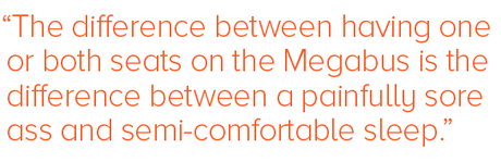 The difference between having one or both seats on the Megabus is the difference between a painfully sore ass and semi-comfortable sleep. If you’re on a relatively empty bus, you should have no trouble holding onto that spot next to you. Just plop your bag down and pop in some headphones. As the bus fills up in either Oakland or San Jose, you’ll be able to tell from the line outside whether you should move your stuff or pretend to be asleep.