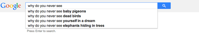 In fact, baby pigeons are so intensely mysterious, that they are the very first autofill suggestion when Googling “why do you never see…”. The first!