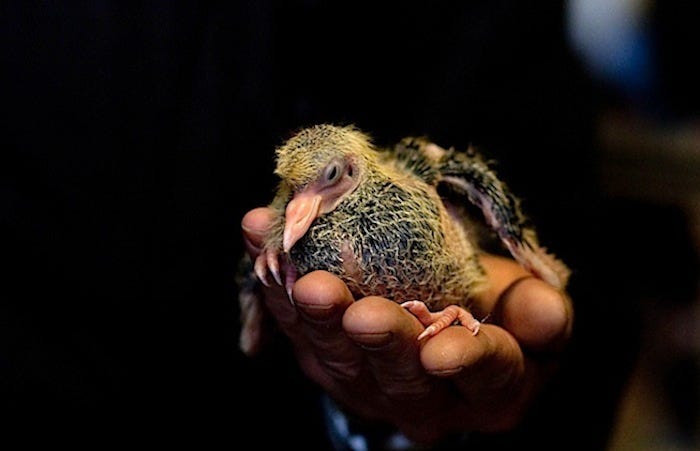 After some intense internet research, I’ve discovered that baby pigeons basically look like Big Bird’s testicles, but with eyes. I’ve also discovered a weird desire to give this first one a tiny comb over: