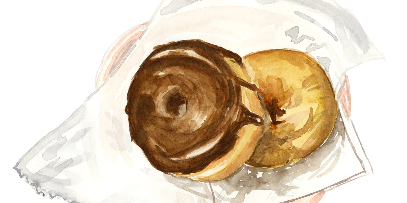 My favorite donuts to date are from Blue Star Donuts in Portland. Somewhat prophetically, that first donut I painted from a magazine was a blueberry glaze from Blue Star. I’m always amazed at how many donuts are out there, so I’m hopeful that my favorite new donut joint is out there waiting for me and my portable watercolor set-up.