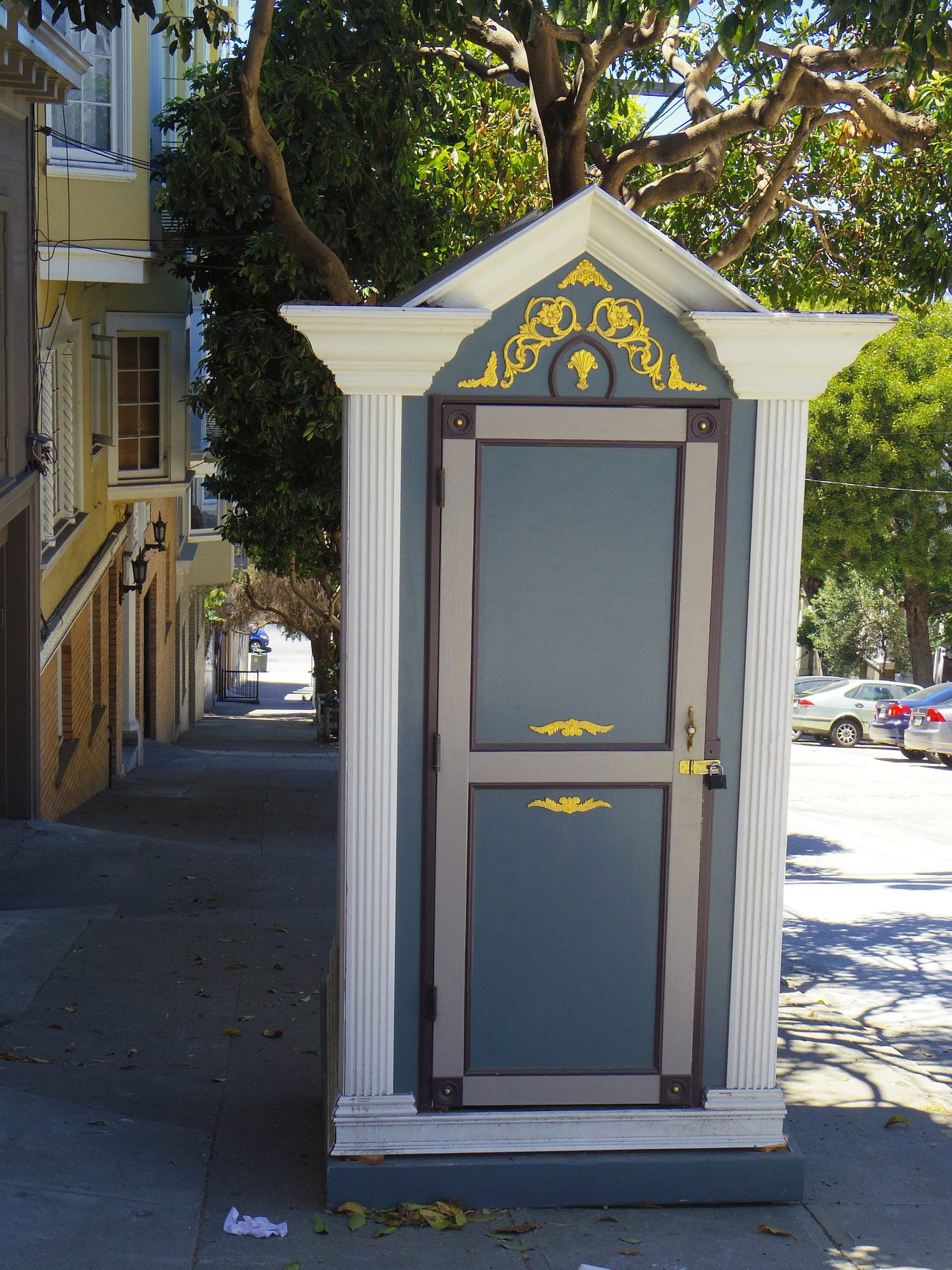 The poster, who uses the name knowledgereport, said he took the photo in Russian Hill, on Filbert Street between Polk and Larkin. He told us nice porta-potties are a fixture in the area but that this is the best one he’s seen by far. One person in the comments section said it was part of an informal contest among contractors to have the sweetest on-site accommodations. Someone else said it probably “still smells like shit inside.”