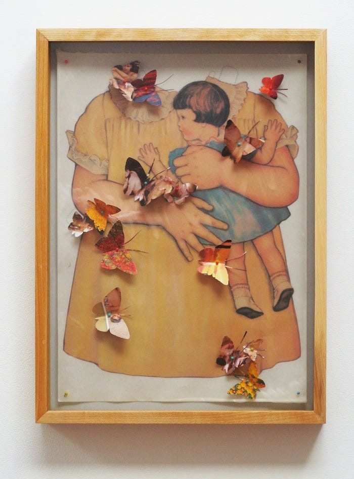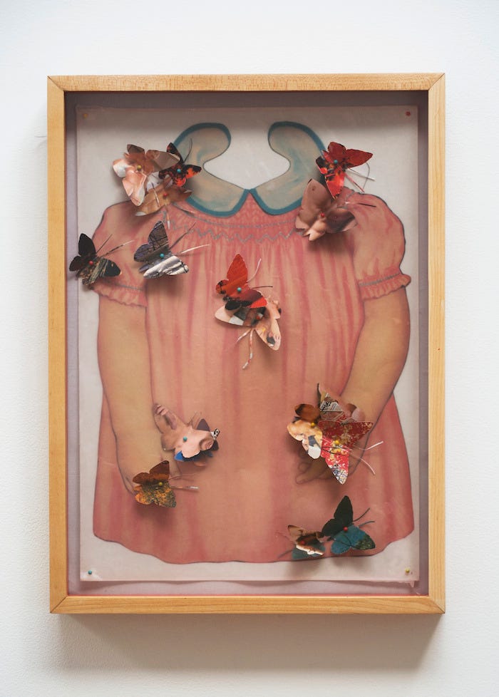 Also, by completing this work and sharing it with the world, I now realize that I really do live in a space that facilitates a great deal of creativity and layered thinking which can often be misunderstood. My series “Expectations of a Prescribed World,” (pictured above) explores the disembodied construction of gender and identity in our society. It has recently been met with some controversy where viewers misinterpreted the doll dresses for young children placed in proximity to the pornographic cutouts of butterflies. These dresses are not meant to portray little girls, but rather a representation of society’s construction of how a little girl should look.