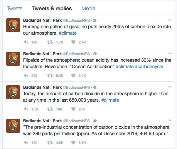 3. The resistance builds. A rogue employee of Badlands National Park posts multiple tweets about atmospheric carbon dioxide levels; they are deleted hours later.