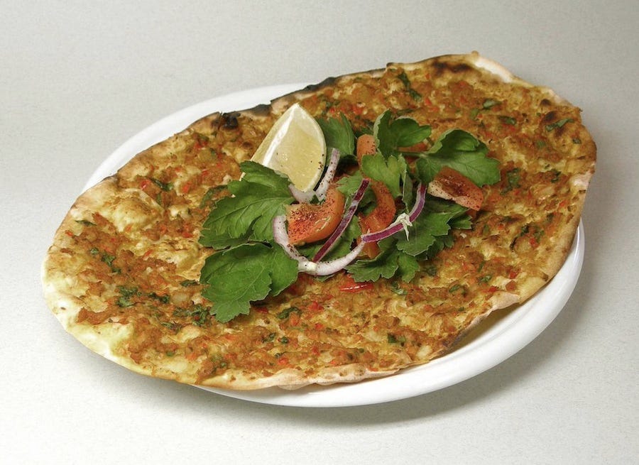 Angela takes me back to the kitchen where all the food is made. There’s a group of chefs prepping fresh vegetables. She explains that they’re getting ready to make some lahmajun. “It’s basically Armenian pizza,” she says.