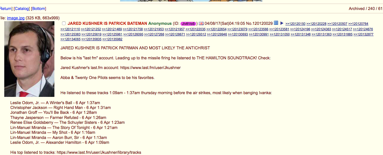 Three days ago, some enterprising sleuth reported on 4chan’s “politically incorrect” board that they’d found Jared Kushner’s profile on Last.fm, a site that lets users publicly log the music they listen to.