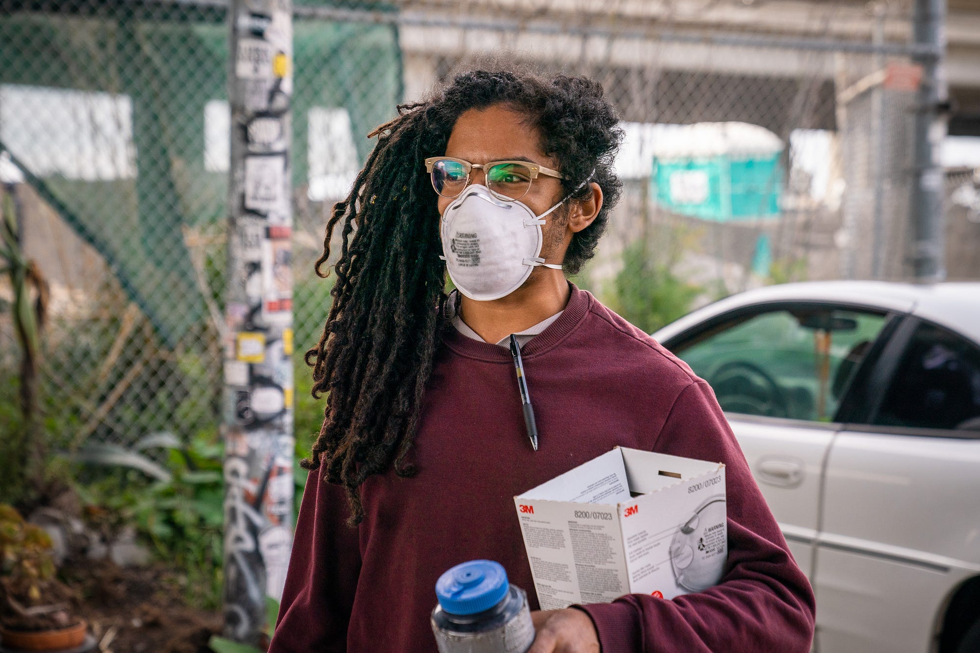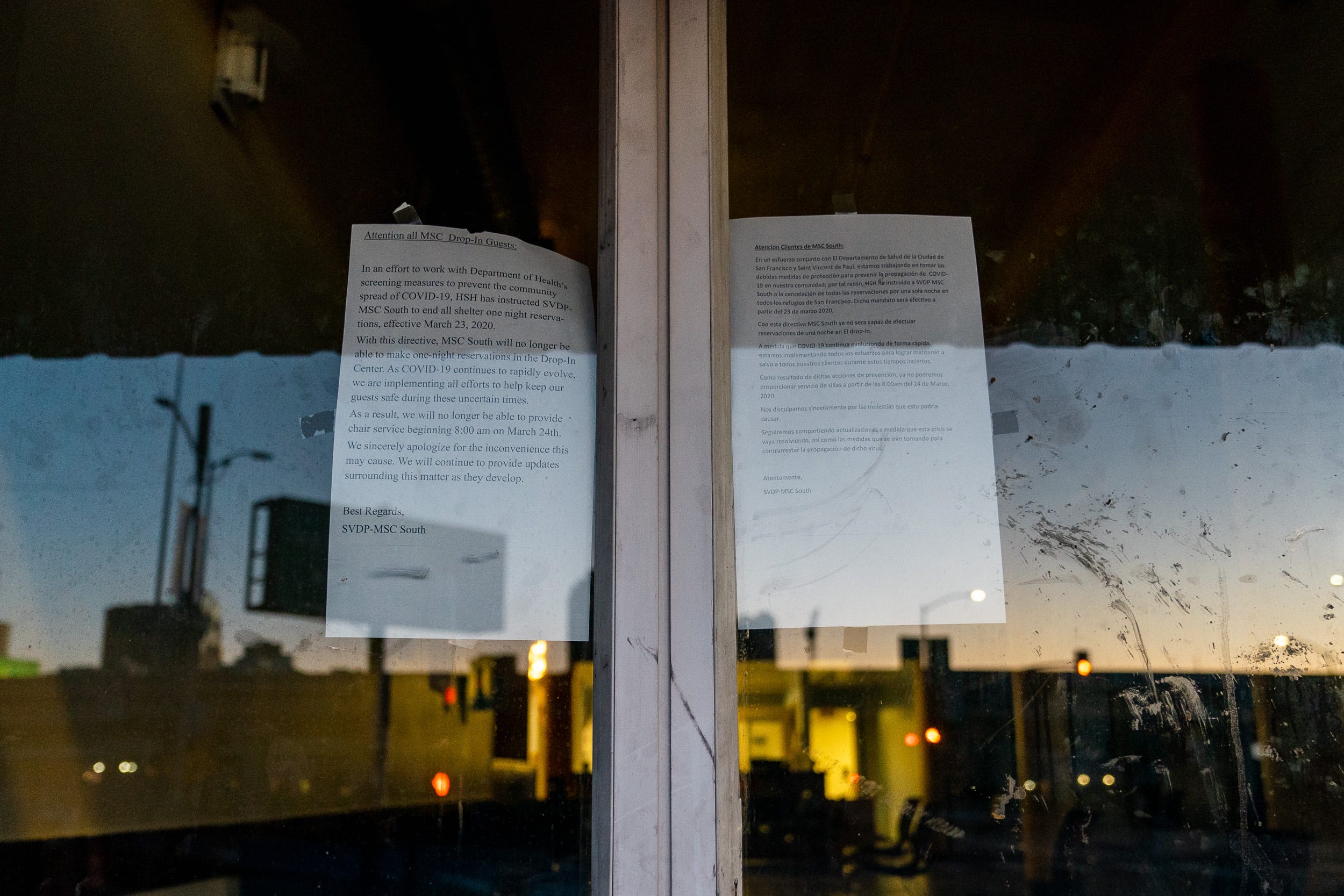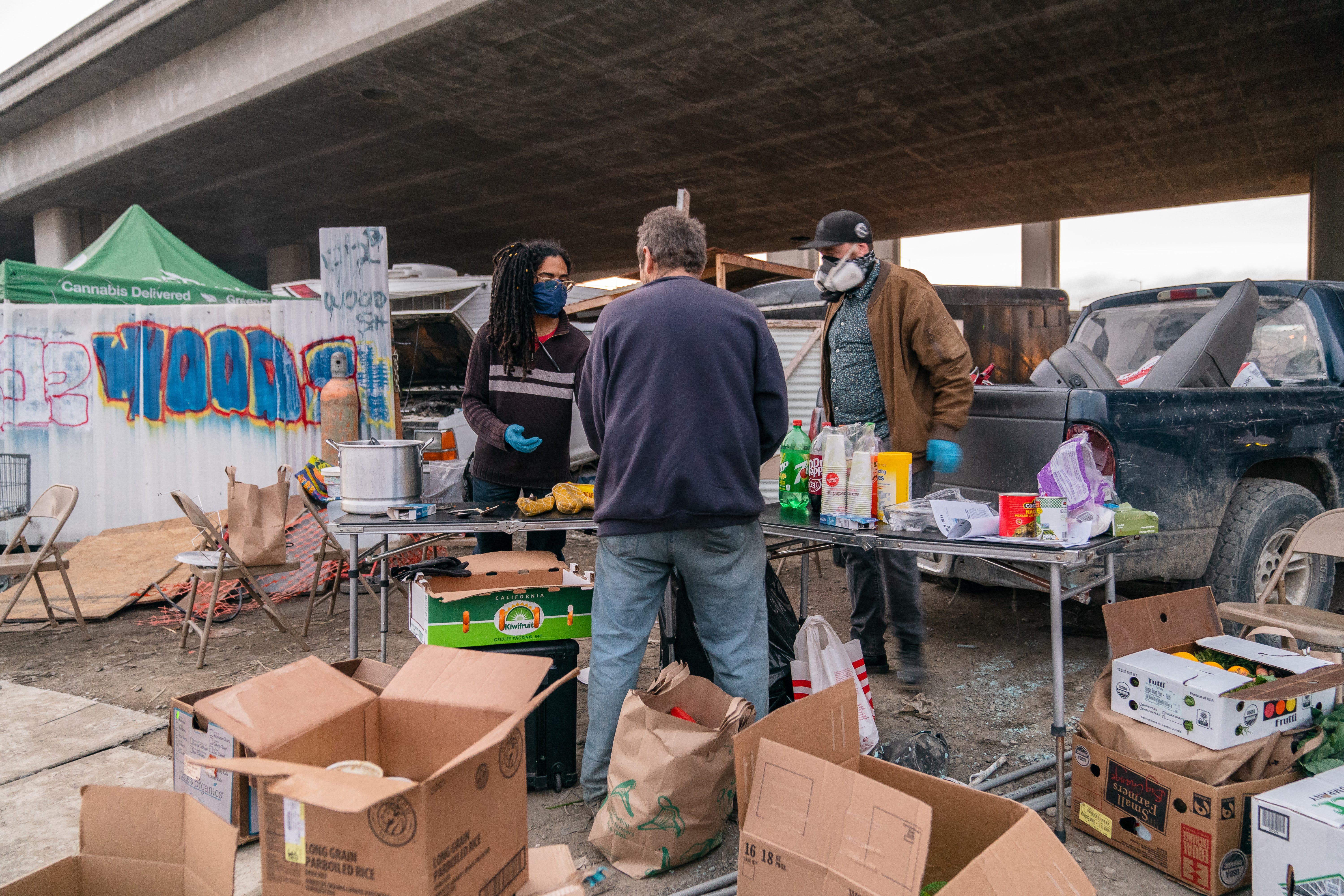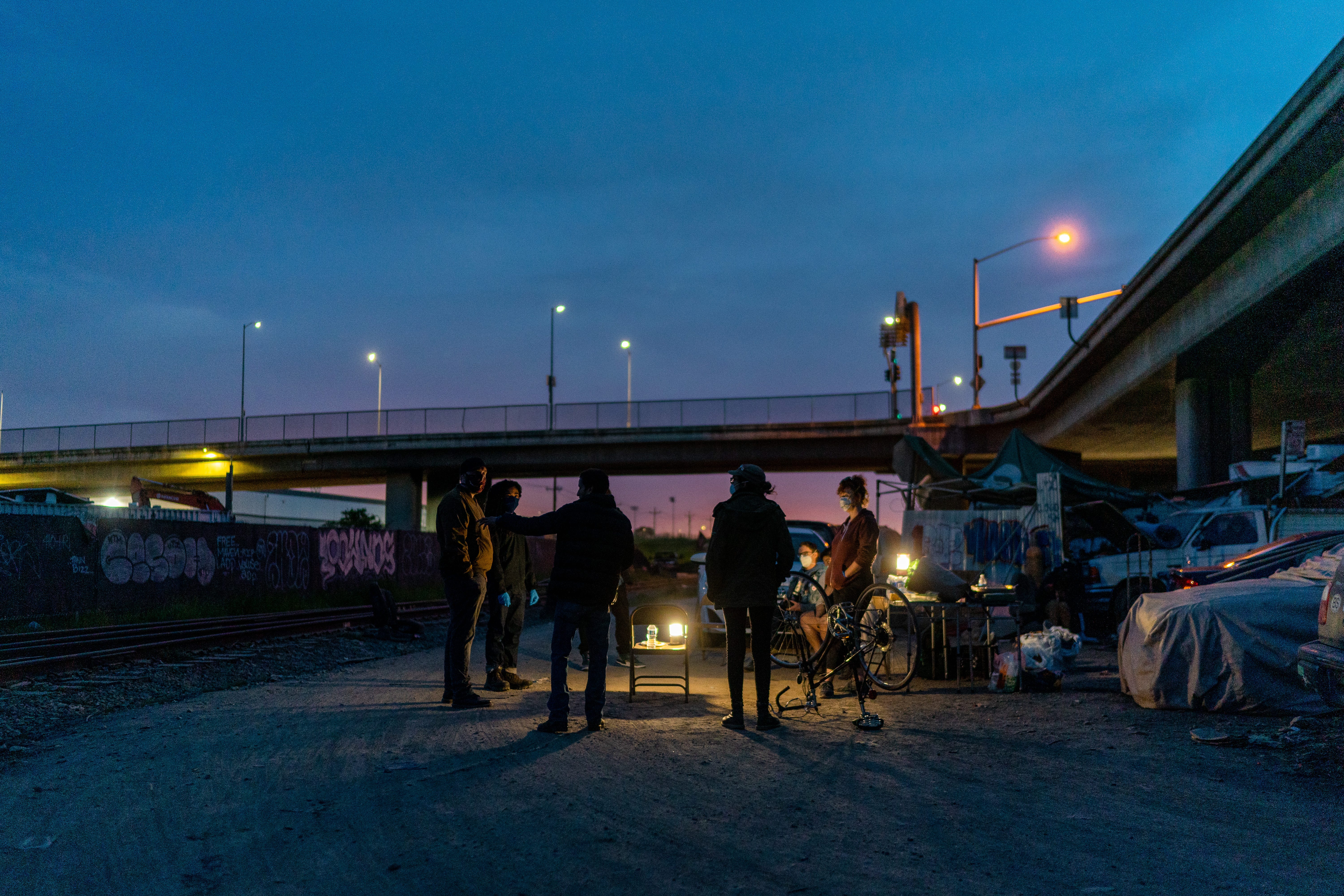 The streets are quiet and nearly empty in the SOMA neighborhood of San Francisco on the evening of March 20. Six Bay Area counties including San Francisco County issued shelter-in-place orders that began March 17.Larry, a resident of the Wood Street Collective, poses for a photo while eating lunch in Oakland on April 12.Members of the United Front Against Displacement host a weekly community meeting for residents of the Wood Street Collective in Oakland. The group has been working with residents to understand their needs to provide support and essential services not provided by the city.Left: A protestor urges San Francisco Mayor London Breed to provide shelter for homeless people in vacant hotel rooms, leading chants from their car outside the Moscone Center homeless shelter in San Francisco on April 3. Right: Signs on the windows of the Multi-Service Center South homeless shelter inform people that one-night reservations are no longer available due to Covid-19. Three days later, 68 long-term residents at the shelter and two staff members tested positive for Covid-19. The most recent report puts those numbers at 96 residents and 10 staff. Homeless advocates have called for the city to house homeless residents in hotels during the pandemic to avoid the spread.Floor mats and pillows for homeless people fill one of the halls at Moscone West shelter in San Francisco. The city said it would use the convention center and other designated locations as temporary shelters but later revised its plans after backlash from homeless advocates who said the layout of the rooms didn’t allow for proper social distancing.Dayton Andrews, an activist with the United Front Against Displacement, holds face masks to distribute to residents of the Wood Street Collective in Oakland.Portland (left) and Xochitl Bernadette Moreno prepare soup for residents of Wood Street at Restore Kitchen in Oakland.Volunteers bottle homemade hand sanitizer to be distributed to homeless residents in Oakland. Many people experiencing homelessness don’t have access to running water or the ability to wash their hands regularly. The Centers for Disease Control and Prevention recommends both handwashing and using hand sanitizer to help prevent the spread of Covid-19.Dayton Andrews (left) serves food to a Wood Street resident with the help of Dale Smith (right) in Oakland. The United Front Against Displacement serves residents meals to take back to their tents and vehicles several times a week.Bacon (foreground) and another dog play in the afternoon sun at the Wood Street Collective in Oakland. The United Front Against Displacement also provides food for residents’ pets.Wood Street resident Amanda stands in front of an Oakland Police Department vehicle parked within the Wood Street Collective in Oakland. Residents have complained about increased police presence since the shelter-in-place order went into effect.Homeless residents and members of the United Front Against Displacement protest in front of Oakland Mayor Libby Schaaf’s house. The group’s demands include services and support for homeless people and an end to police harassment.Christin Evans with Homeless Youth Alliance unboxes donated tents inside her garage in San Francisco. Evans and other homeless advocates solicited the donations on Twitter and have received as many as 40 tents in a single day. Tents are distributed to homeless residents across the city in collaboration with several outreach organizations.Supplies for a temporary homeless shelter at Moscone West are pictured in the hallway of the convention center in San Francisco.Xochitl Bernadette Moreno carries a box of supplies for providing homeless people with meals in Oakland. Moreno is a member of Essential Food and Medicine and works with multiple organizations to feed people in need throughout the East Bay.Volunteers build handwashing stations for homeless people in Oakland.An activist performs maintenance on a handwashing station after receiving feedback from a Wood Street resident. This is the fourth generation of handwashing stations that the United Front Against Displacement has built for residents.Ben and Cassidy of the United Front Against Displacement walk through the Wood Street Collective while checking in with residents.Tony Fuentes Diaz, 40, sits in front of his RV with light from his truck headlights at the Wood Street Collective. Diaz is a trained solar technician and is planning to build a solar power station for all residents to use because the city doesn’t provide sanctioned electrical service to the community.A sign in the windows of Multi-Service Center South, the largest homeless shelter in San Francisco, offers a positive message. Nearly 100 residents of the shelter and 10 staff members have tested positive for Covid-19.